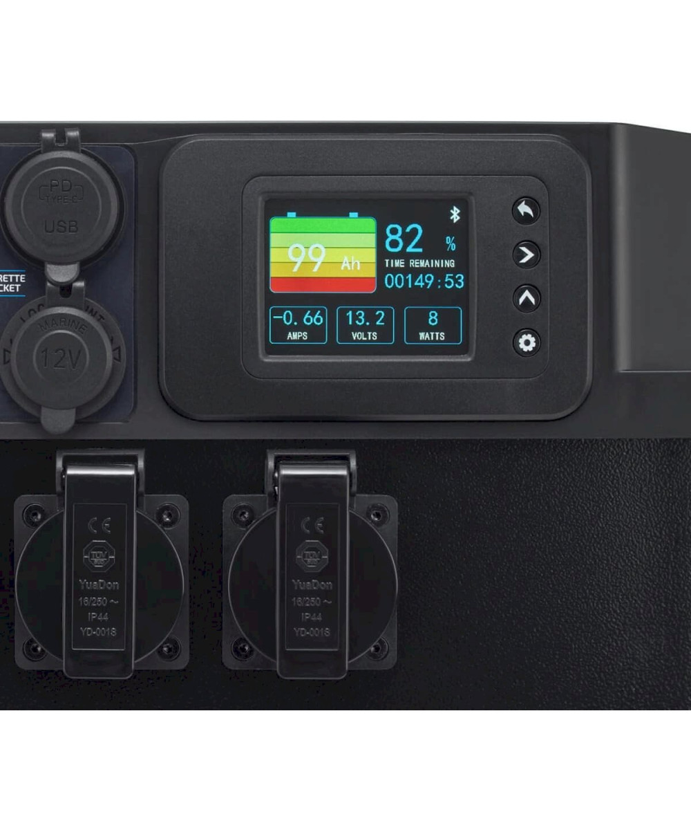 Die Anschlüsse und der Wechselrichter werden über eine moderne und sichere Lithium-Eisenphosphat-Batterie (LiFePO4) mit Strom versorgt. Zur Auswahl stehen Batteriekapazitäten von 1536Wh (Modell 120S), 2560Wh (Modell 200S) und 3840Wh (Modell 300S).