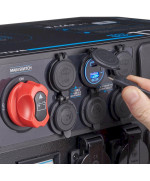 - DC-12-V-Anderson-Stecker (50 A oder 175 A) dienen dem Anschluss von DC-12-V-Geräten wie beispielsweise Leuchten oder DC-Kühlschränken. Der 175-Ampere-Anschluss ist vor allem für Geräte mit höherem Stromverbrauch gedacht und kann sogar über das entsprechend mitgelieferte Kabel bei Bedarf Starthilfe für Ihr Auto leisten.