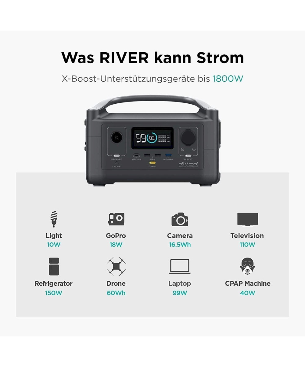 1 * RIVER 288 Wh tragbare Akku-USV, 3 Typen von Ladekabeln (1 * 1,5 m Wechselstromladekabel, 1 * 1,5 m Autoladekabel, 1 * 1,5 m MC4 auf XT60 Solarpanelkabel), 1 * Benutzerhandbuch.Scheda dati