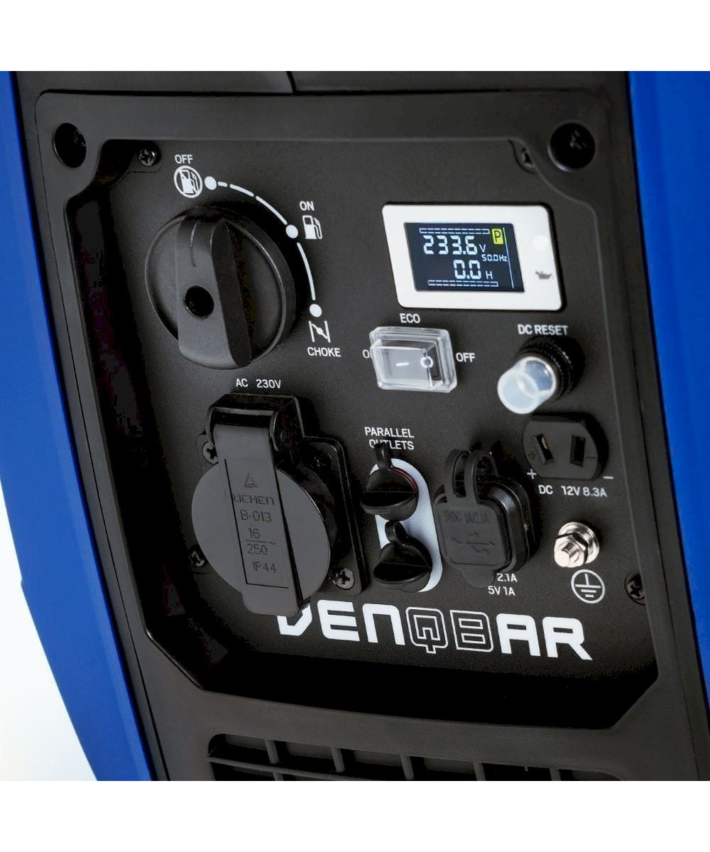 Im Bereich der mobilen Stromerzeugung setzt DENQBAR mit der eBLUE® 2.0 Baureihe neue Standards. Neben der neuen Motorengeneration und der innovativen sowie stabilen Elektronik wird weniger Kraftstoff gegenüber herkömmlichen Generatoren verbraucht. Nicht nur das effiziente Anpassen des Inverters an die Verbraucherleistung, sondern auch das neue Startsystem mit voll elektronischer Zündung für noch mehr Bedienkomfort, sprechen für die frisch eingetroffene Inverter-Modellreihe. Durch die eBLUE® 2.0-Technologie läuft der Motor des Generators laufruhiger und passt sich individuell an. Die dabei erzeugten Tonfrequenzen lassen den Generator akustisch leiser wirken, was das Einsatzspektrums des DQ-2100 deutlich erhöht. - Display
