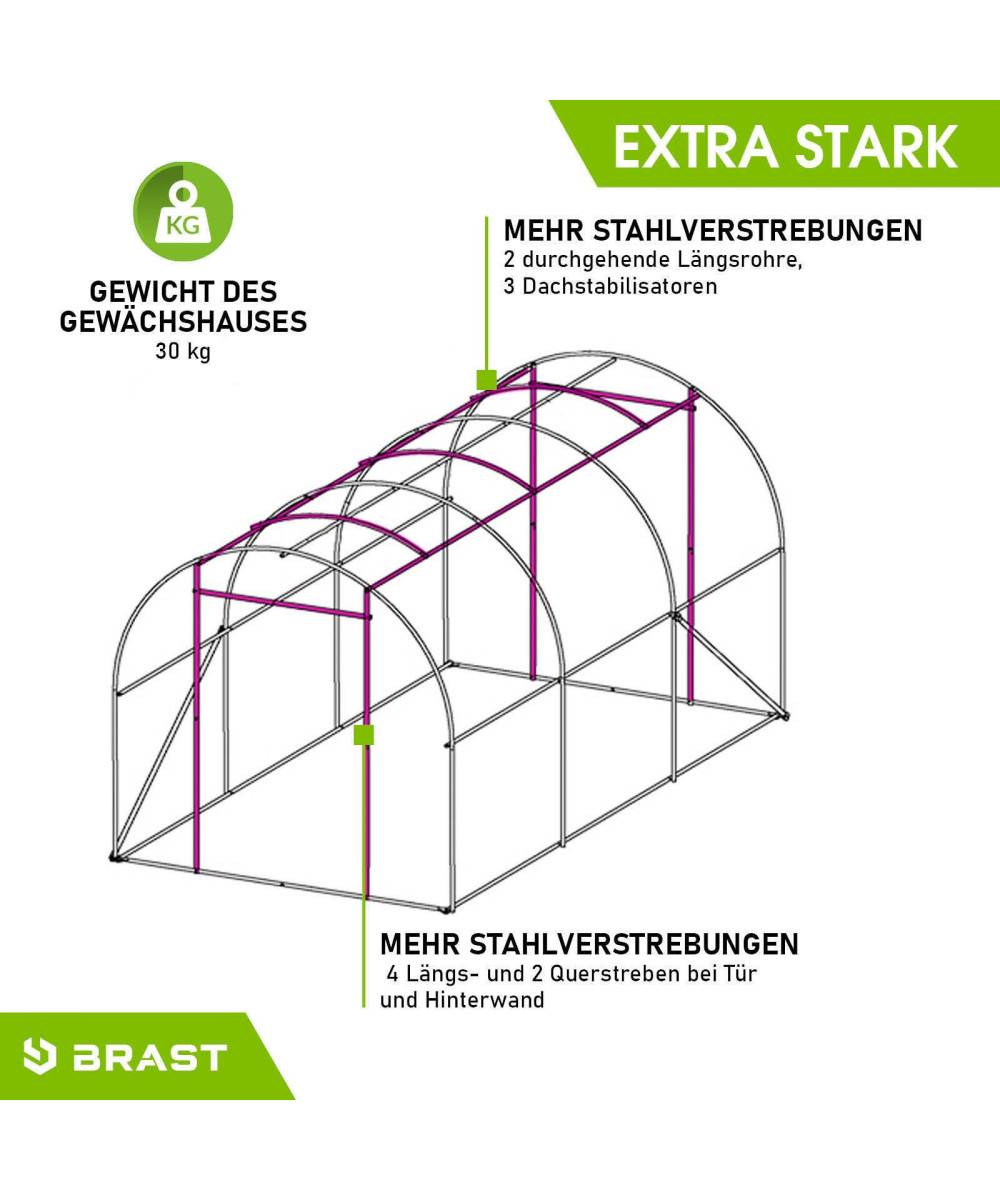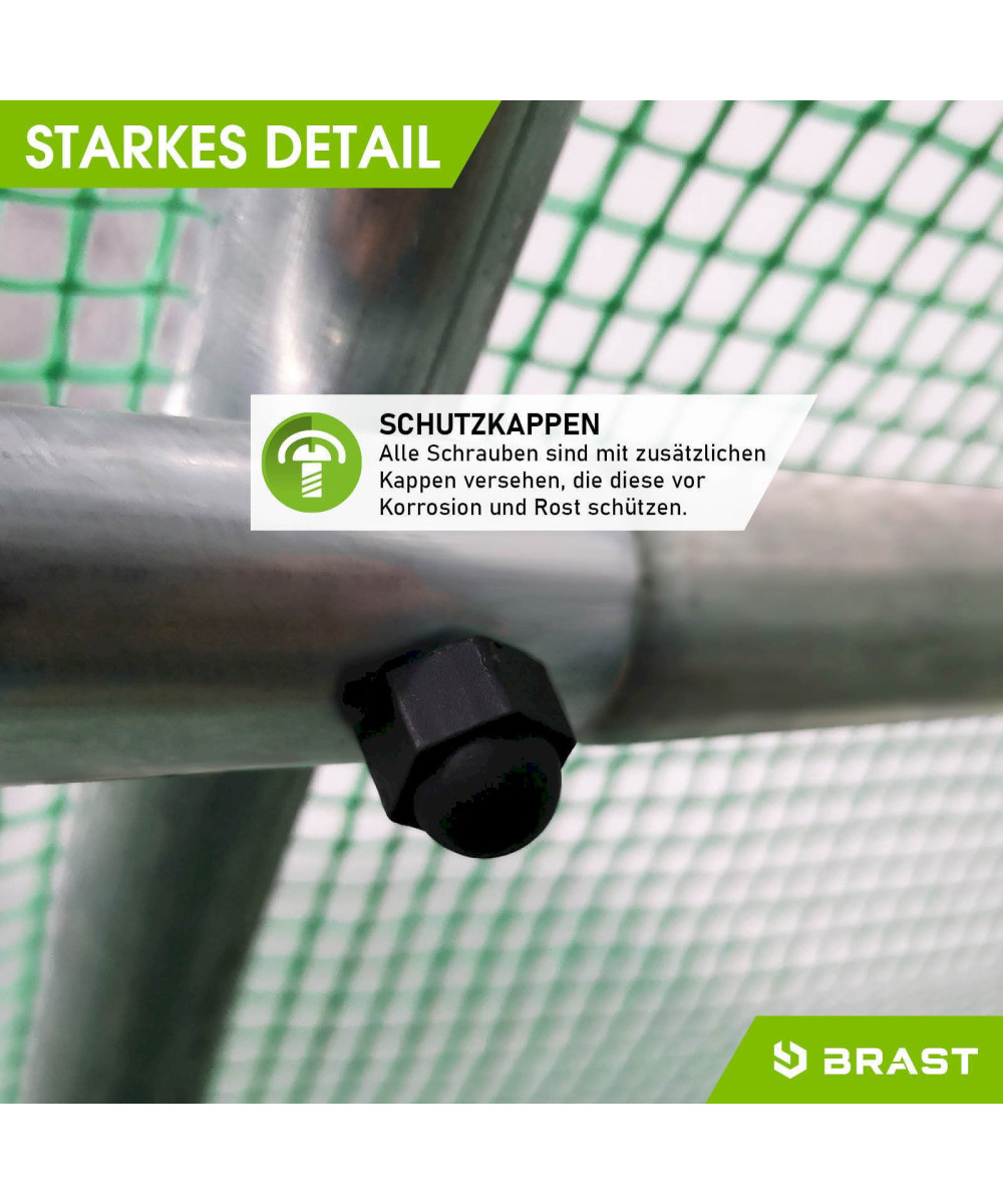 - Alle Stahl-Profile des BRAST Foliengewächshauses 2x3m sind mit selbstsichernden Schrauben verschraubt.
