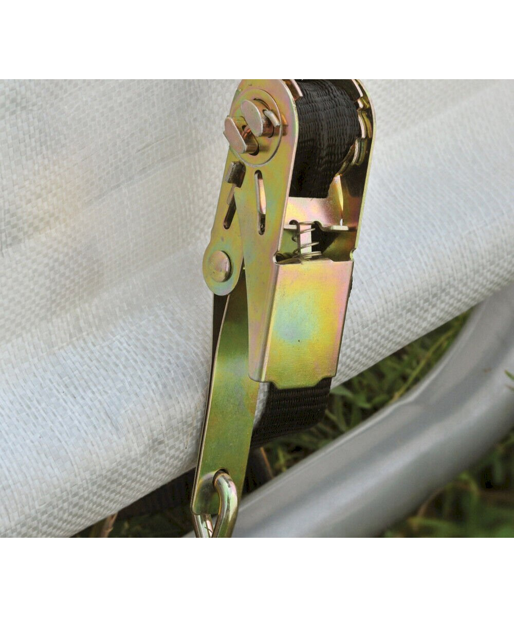 8 Stk. mitgelieferte Zurrgurte sichern die Festigkeit der Plane am Gestell bei Wind und Wetter. Im Lieferumfang sind 4 Stk. Sturmanker (38cm) zur festen Verankerung im Boden enthalten. Ein Fundament ist nicht erforderlich. In nur einer Box verpackt.