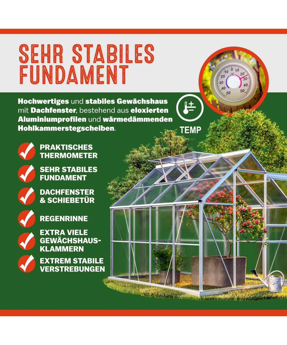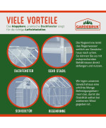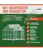 Hochwertiges und stabiles Gewächshaus mit 2 Dachfenstern, bestehend aus eloxierten Aluminiumprofilen und wärmedämmenden Hohlkammerstegscheiben. Die klappbaren, praktischen Dachfenster sorgen für die richtige Luftzirkulation. Die Regenrinne lenkt das Regenwasser seitlich am Gewächshaus nach unten. So können Sie es mit entsprechenden Behältnissen direkt abfangen und nutzen.