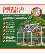 Das Fundament aus verzinktem Stahl sorgt für zusätzliche Stabilität für Ihr Gewächshaus. Durch das Fundament steht Ihr Gewächshaus stabil und rechtwinkelig. Das Fundament verhindert ein Absinken des Gewächshauses auf weichem Untergrund und bietet die beste Möglichkeit der Bodenverankerung.