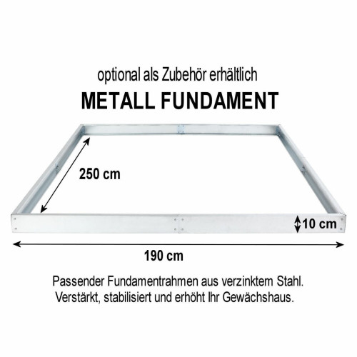 Fundamentrahmen aus verzinktem Stahl. Verstärkt, stabilisiert und erhöht Ihr Gewächshaus.