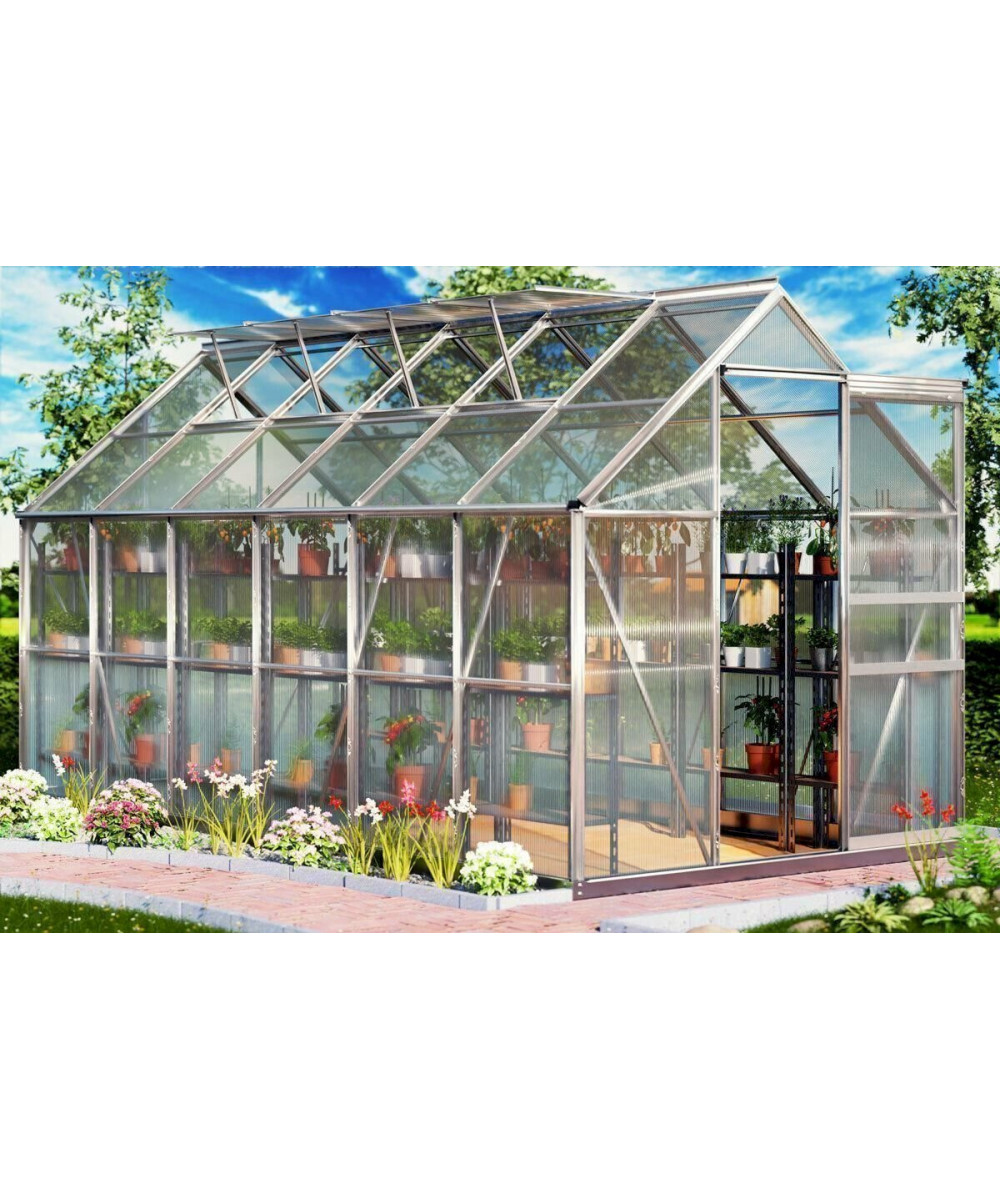 Hochwertiges und stabiles Gewächshaus aus eloxierten Aluminiumprofilen und wärmedämmenden Hohlkammerstegscheiben.