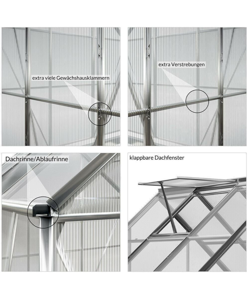 Das Gewächshaus verfügt über 4 Lüftungsfenster zur optimalen Luftzirkulation und 2 Regenrinnen. Die Regenrinne lenkt den Regenfluss seitlich am Gewächshaus nach unten. So können Sie das Regenwasser mit entsprechenden Behältnissen direkt abfangen und nutzen.