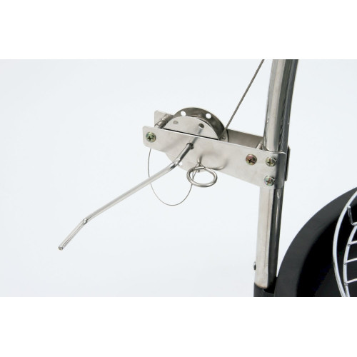 Die Aufrollmechanik ermöglicht Ihnen, das Grillrost hoch zu kurbeln und herab zu lassen. Das Stahlseil läuft über eine Metallrolle. Mit dem Splint lässt sich das Grillrost auf eine bestimmte Höhe feststellen.
