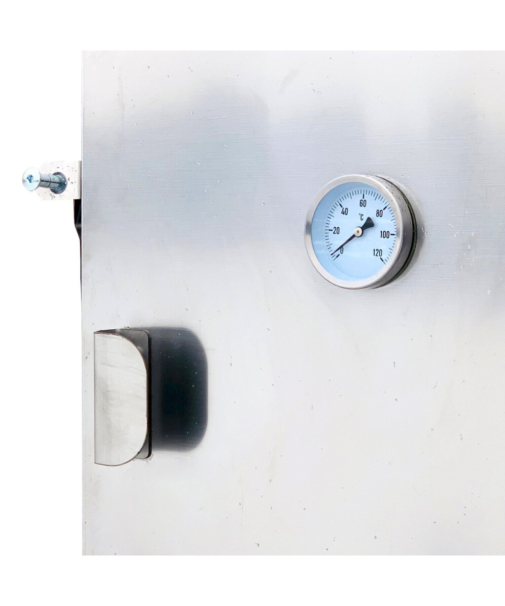 Durch das Thermometer wird die Kontrolle der gewünschten Temperatur ermöglicht. Die Außenseite des Gehäuses ist aus Rostfrei Stahl, und dadurch widerstandsfähiger gegen alle Arten von Schäden und Wetterbedingungen.