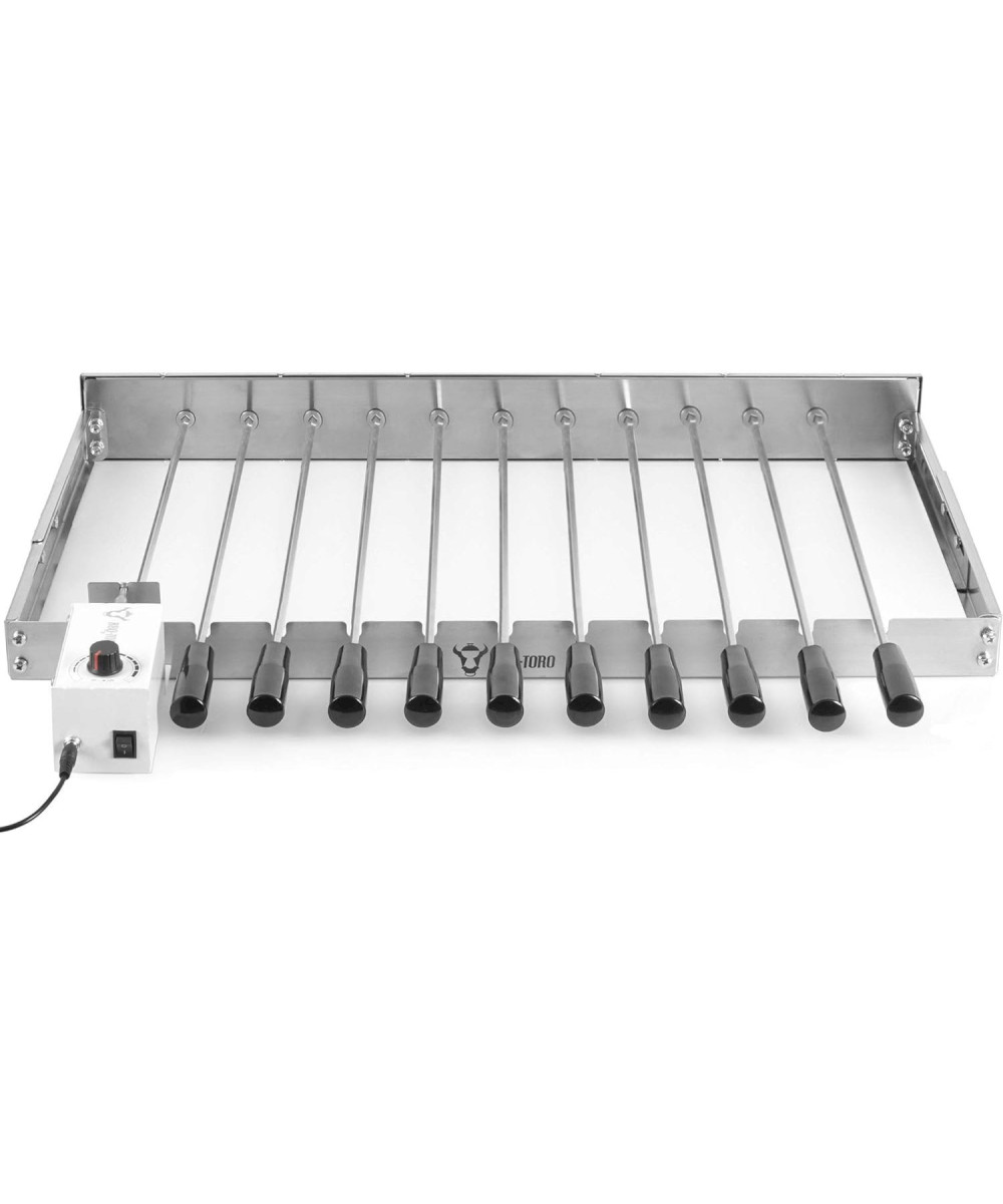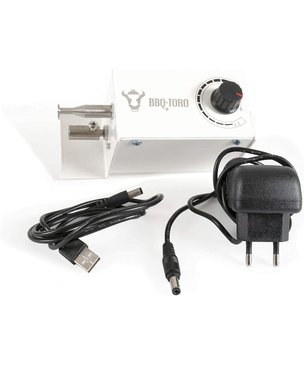 Mit dem elektrischen BBQ-Toro Spießdreher können Sie bequem und ohne großen Aufwand leckere Grillspieße herstellen. Durch den elektrischen Antrieb werden alle Spieße gleichmäßig gedreht und das Grillgut bleibt saftig und zart. Die Drehgeschwindigkeit kann am Motor stufenlos eingestellt werden.