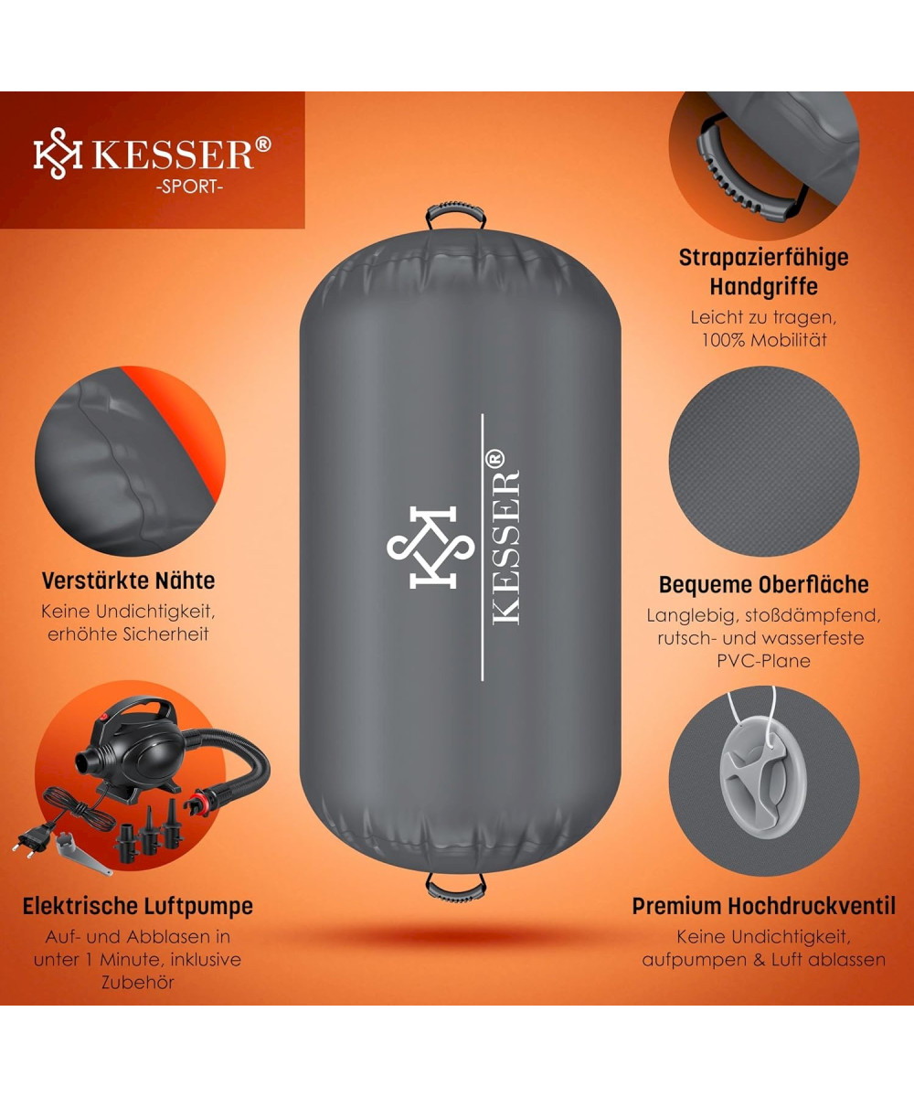 Die Vielseitigkeit der KESSER Airrolle wird Sie begeistern. Sie ist nicht nur in der Turnhalle einsetzbar, sondern auch im Freien und sogar auf dem Wasser. Mit ihrem doppelseitigen Fallstitch-Material und der 0,9 mm dicken UV- und wasserfesten PVC-Plane ist sie für nahezu jede Aktivität bereit. Diese Rolle kann Belastungen von 200-300 kg standhalten und bleibt auch nach 72 Stunden noch hart aufgeblasen.