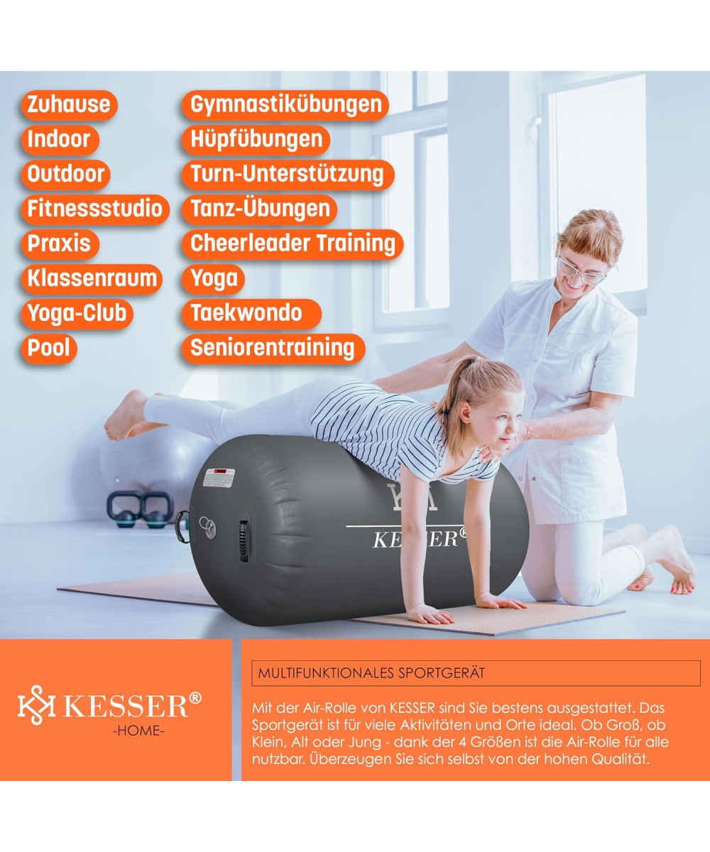Die KESSER Airrolle ist in vier verschiedenen Größen erhältlich, was sie für Menschen jeden Alters und jeder Körpergröße geeignet macht. Egal, ob Sie ein Kind, ein Erwachsener oder ein Sportler sind, diese Rolle passt perfekt zu Ihnen. Sie ist ideal für Yoga, Pilates, Kickboxen, Gymnastik und viele andere Fitnessübungen.