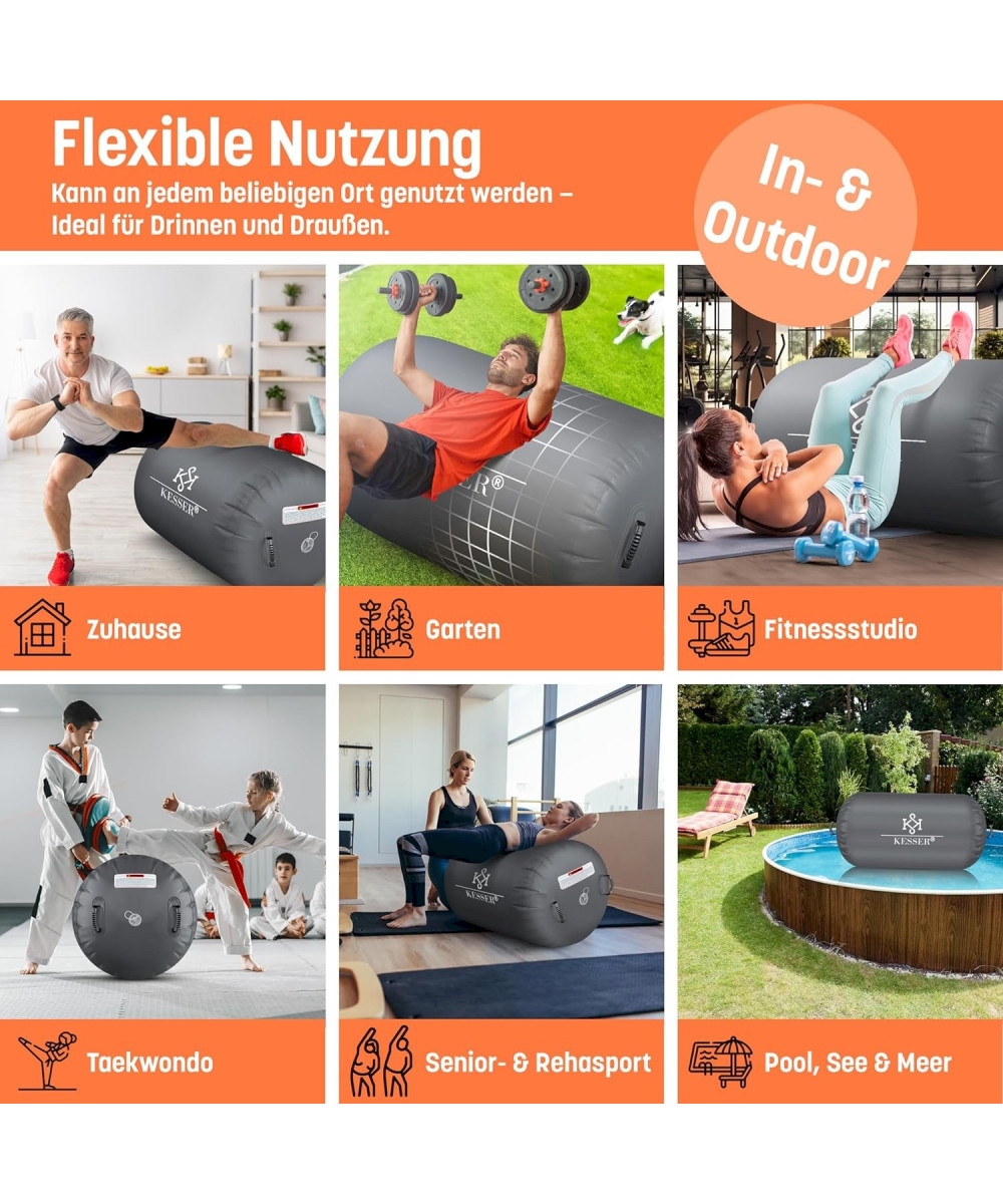 Entdecken Sie die KESSER Airrolle, ein vielseitiges Sportgerät, das höchste Qualität und Langlebigkeit bietet. Diese Airrolle wurde mit einer Fülle von hochwertigen Eigenschaften entwickelt, die sie zur idealen Wahl für Fitness und Entspannung machen. Mit verstärkten Nähten, die Undichtigkeiten verhindern, können Sie sich auf Ihre Übungen konzentrieren, ohne sich um Luftverluste sorgen zu müssen.