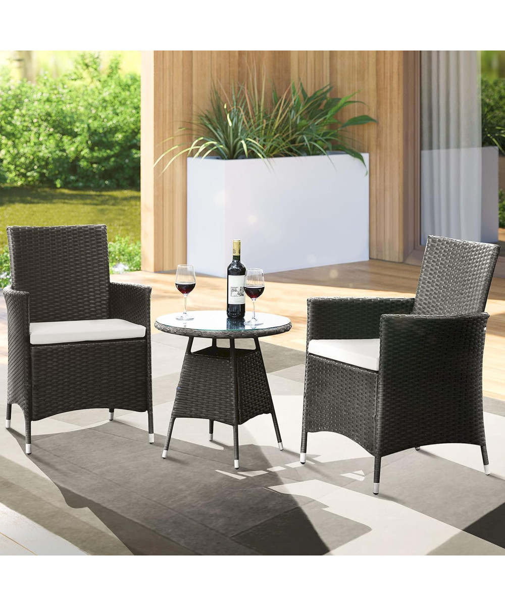 Der Sommer kann kommen: Mit diesem Loungemöbel Set verwandeln Sie Ihren Garten und die Terrasse in eine Wellnessoase. Das Set besteht aus einem Tisch sowie zwei Stühlen. Die bequemen und optisch ansprechenden Gartenmöbel laden zum gemütlichen Verweilen ein. Die Rattan Lounge aus Polyethylen sowie Eisen und Glas ist ein optischer Hingucker, der besonders langlebig und robust gegen Wettereinflüsse ist. Das Sitzkissen aus Schaumstoff machen die Stühle besonders bequem. Die Maße des Tisches betragen ca. 53 x 53 x 54 cm. Die Stühle sind ca. 56 x 59 x 78 cm groß. Die maximale Belastbarkeit des Tisches beträgt 20 Kilogramm und die der Stühle 100kg.