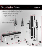 - Max. Belastbarkeit Hantelablage & Bank: 200 kg (inkl. Körpergewicht)