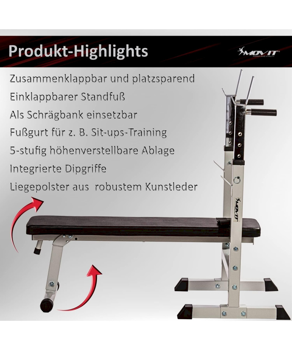 MOVIT Hantelbank BASIC - die platzsparend aufklappbare Kraftstation für Dein Home-Gym! Dank klappbarer Füße kann die Hantelbank auch als Schrägbank genutzt werden kann, inkl. Beingurt als Sicherung bei negativen Sit-Ups.