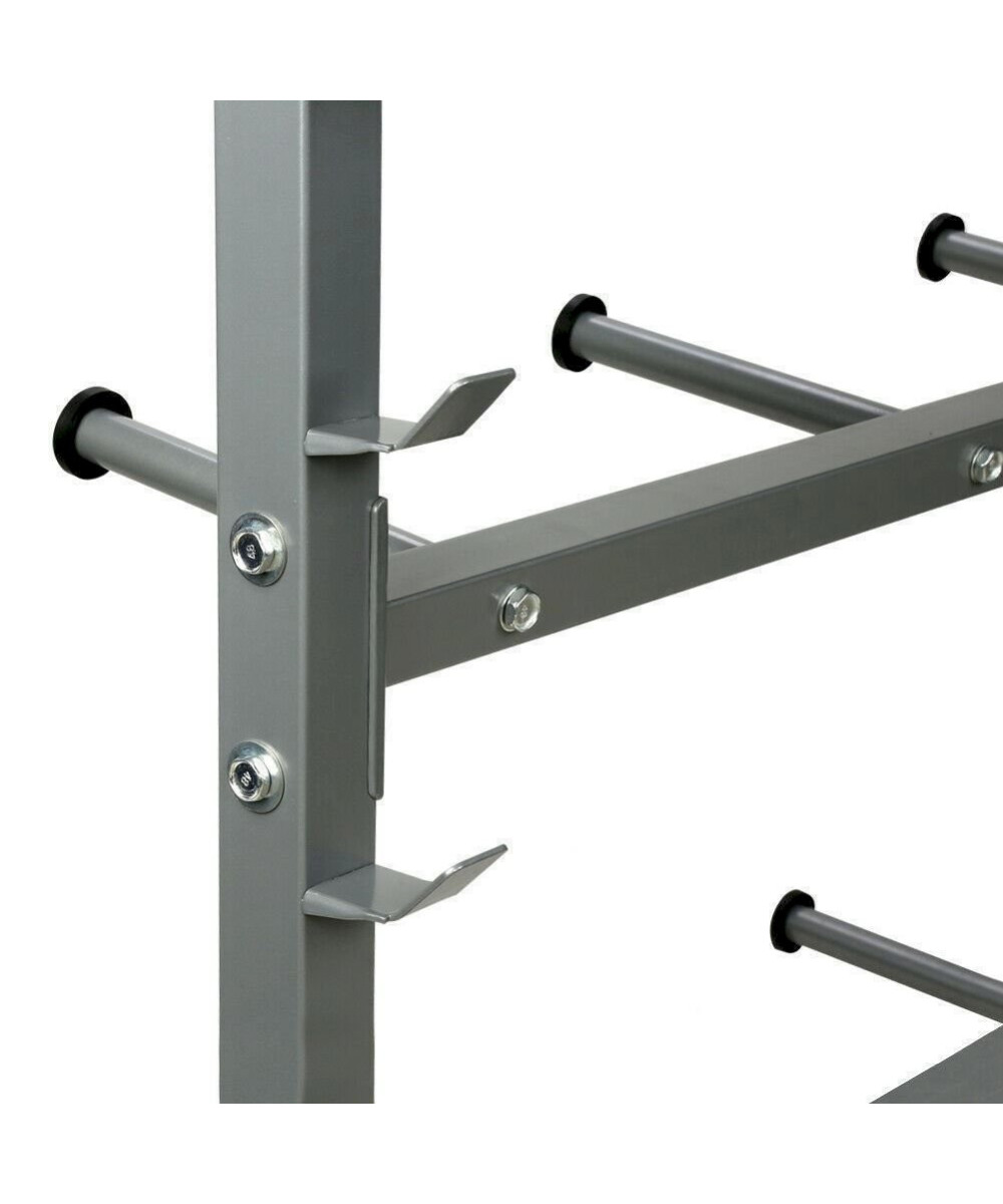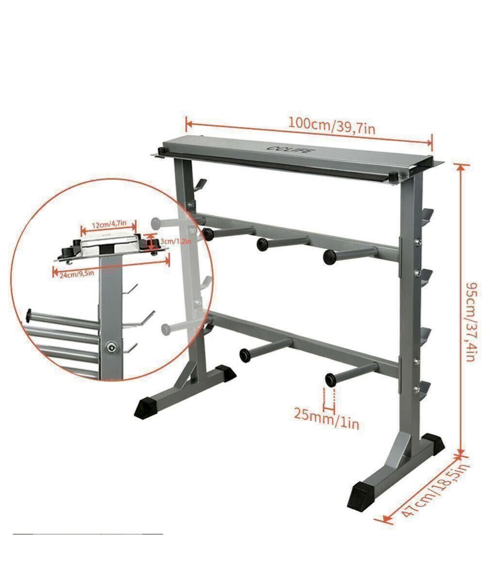 - Genügender Splatz in einem Geräte! 7 Stangen für Hantelscheiben, 4 für Langhantellstange. Ganz oben gibt es noch genug Platz für Kurzhantel.