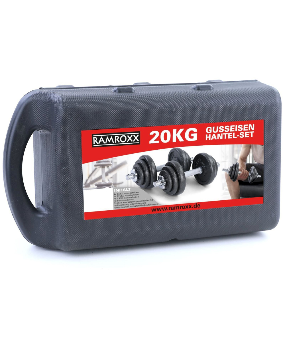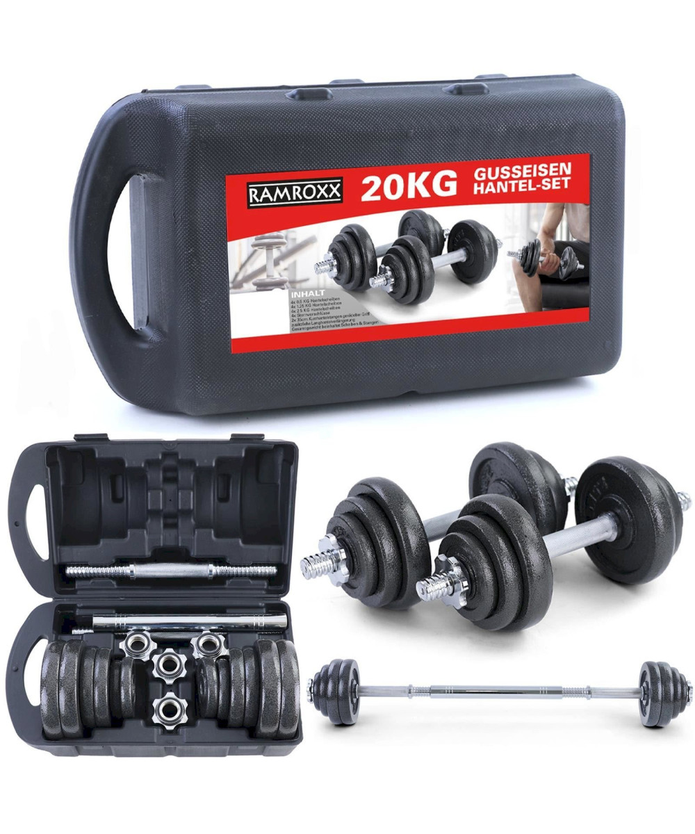 20kg Profi Hantel Kurzhantel + Langhantel Set mit geriffelten Griffen und Sternverschlüssen