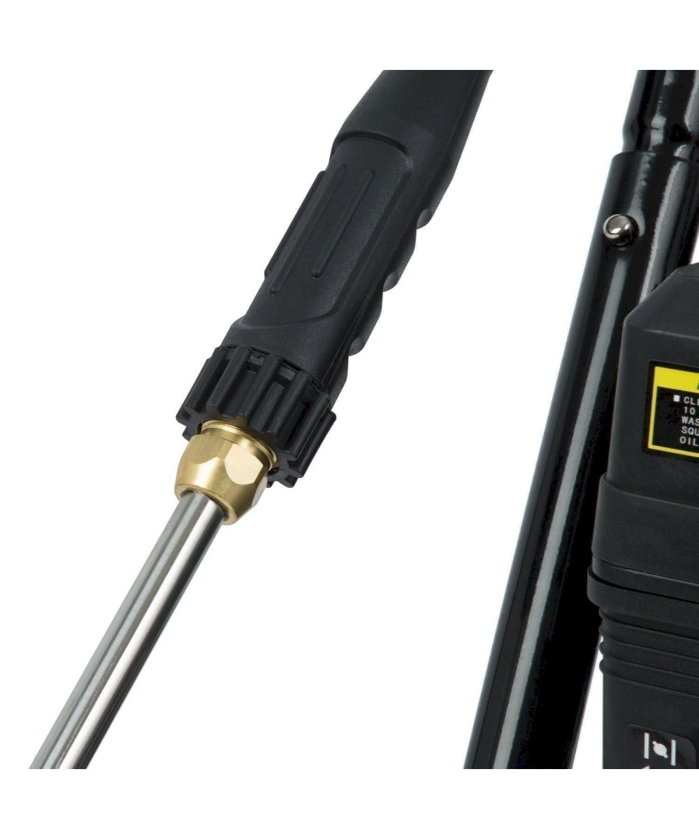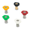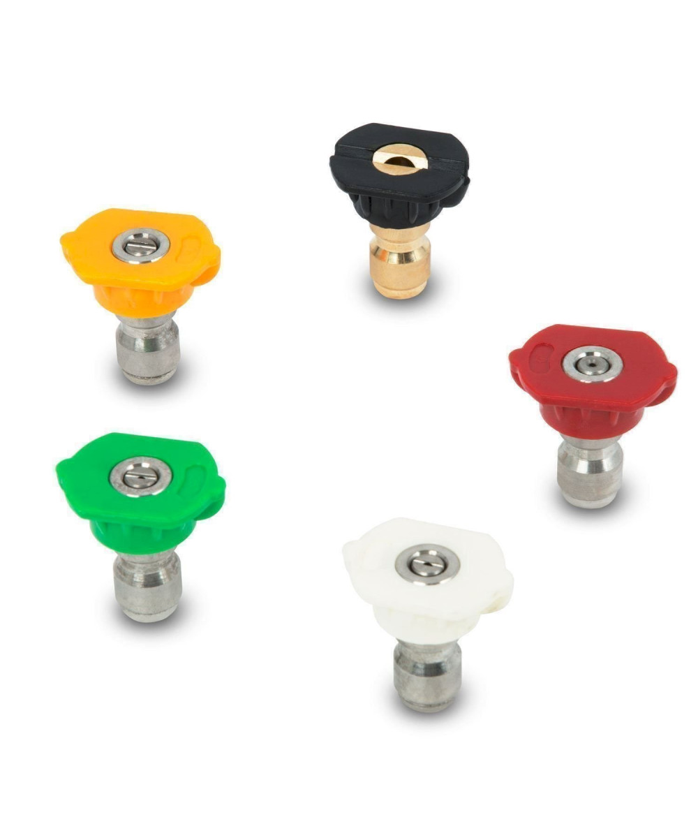 Je nach Art der Anwendung verfügt das Gerät 5 Druckdüsen . Die rote Düse erzeugt einen Punktstrahl mit extrem starken Strahldruck . Die gelbe Düse erzeugt einen Wasserstrahl mit 15° Öffnungswinkel für intensive Reinigungsarbeiten kleiner Flächen . Für mittelgroße Flächen eignet sich die grüne Düse besonders gut. Durch den 25° Öffnungswinkel werden Flächen intensiv gereinigt. Die weiße Düse erzeugt einen Wasserstrahl mit 40° Öffnungswinkel für Reinigungsarbeiten von großen Flächen . Die schwarze Düse hat den geringsten Strahldruck und wird verwendet, wenn Chemikalien oder Reinigungsmittel beigemengt werden .