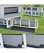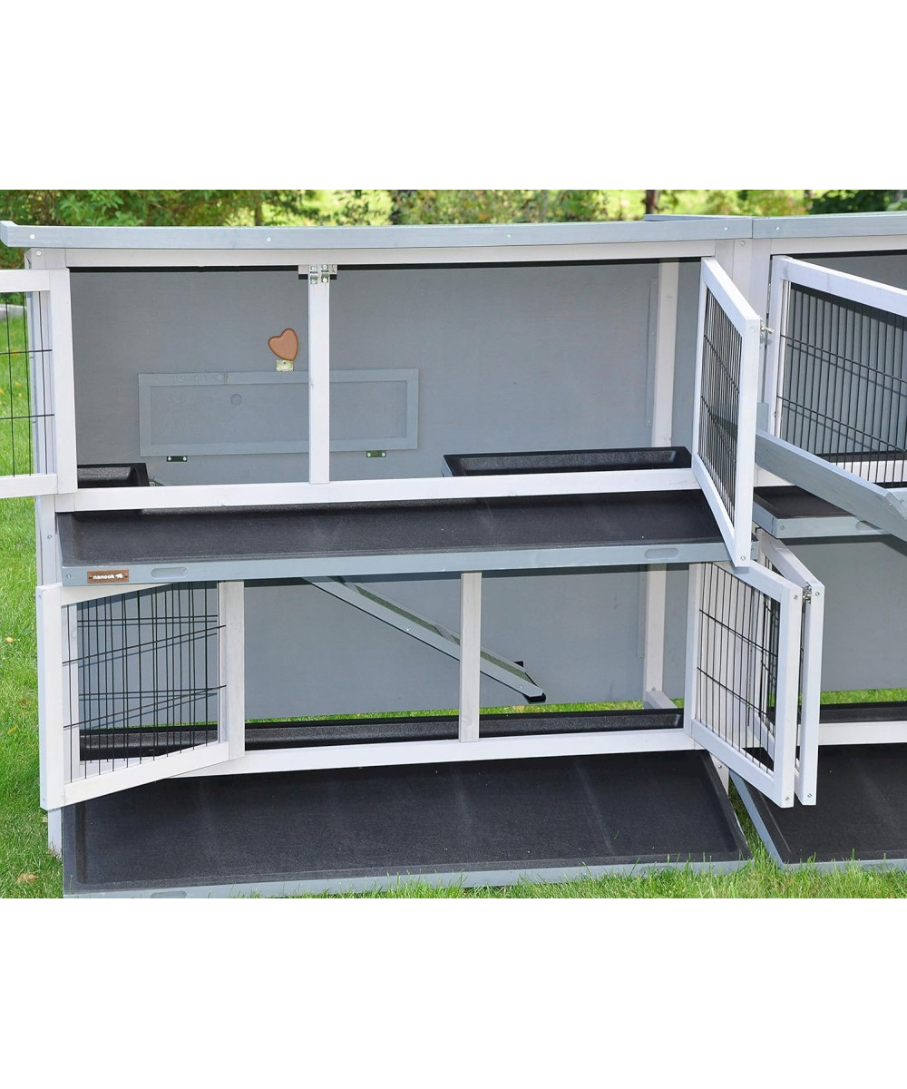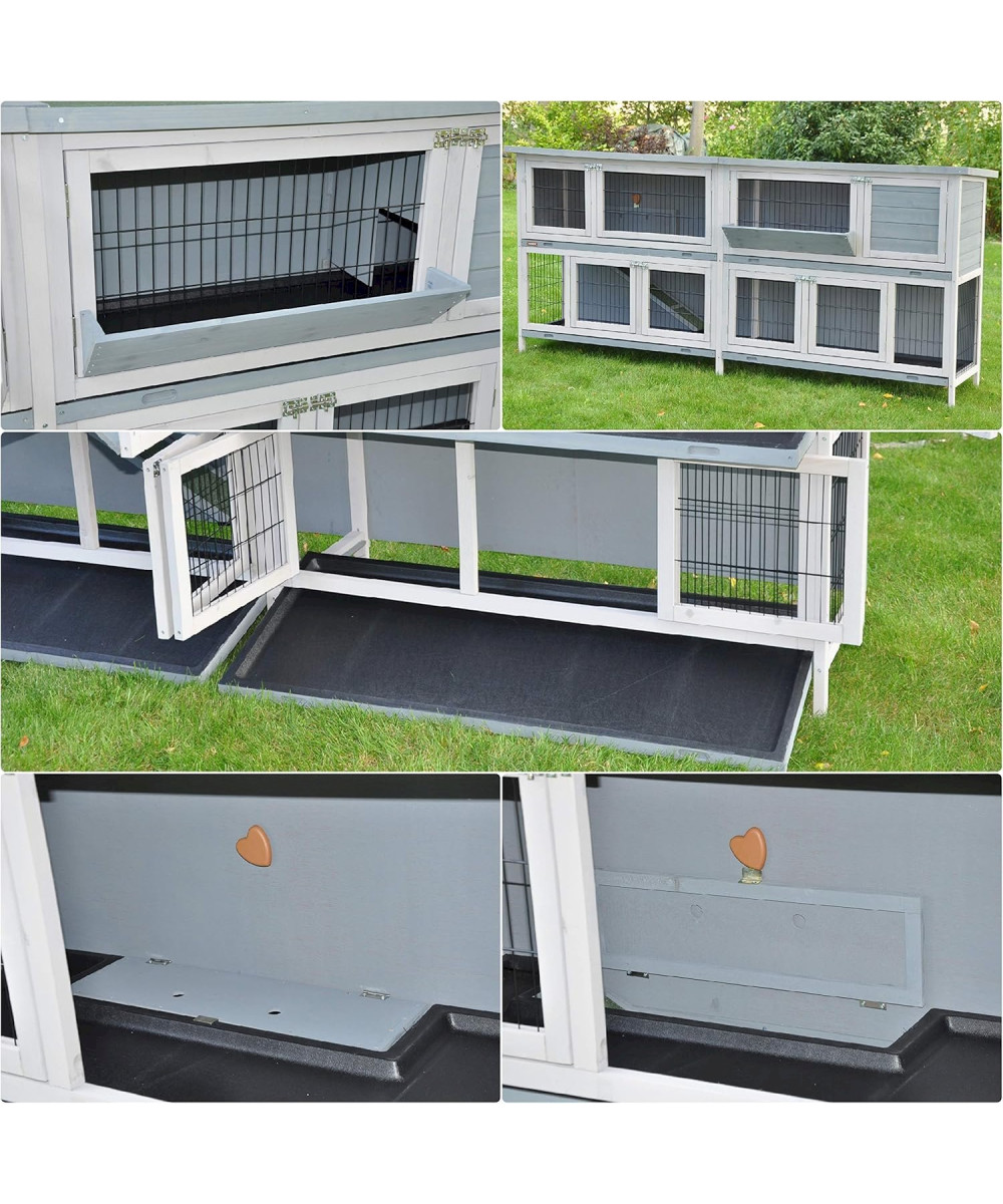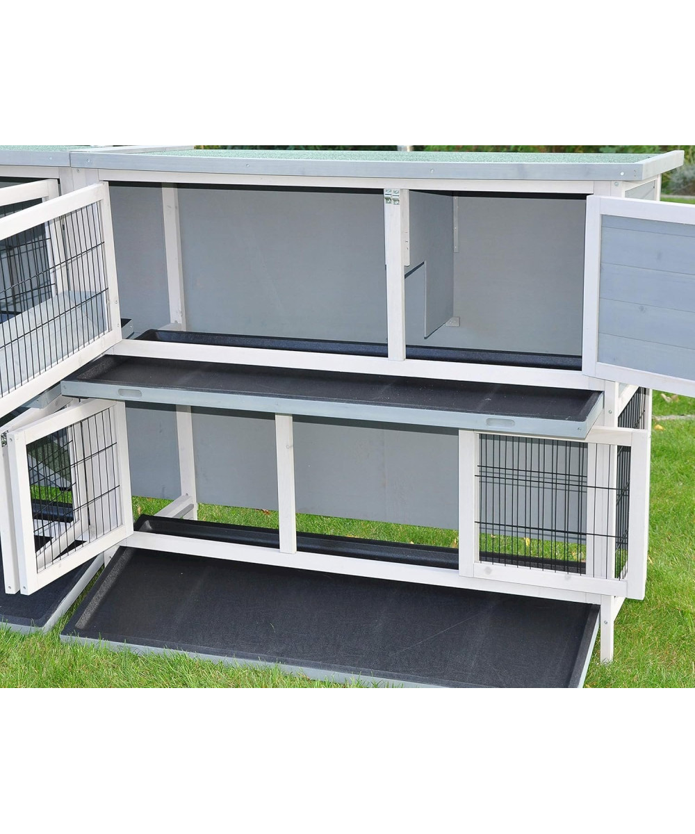 Mehrere Türen ermöglichen einen ungehinterten Zugang in alle Hasenstallbereiche. Für Beschäftigung und Knabberspaß sorgt zudem die zusätzliche Heuraufe für die Futterzufuhr. Der obere Hasenstallbereich lässt sich durch die Klapptür vom Erdgeschoß trennen. Vier herausziehbare Kotwannen ermöglichen die einfache Reinigung.