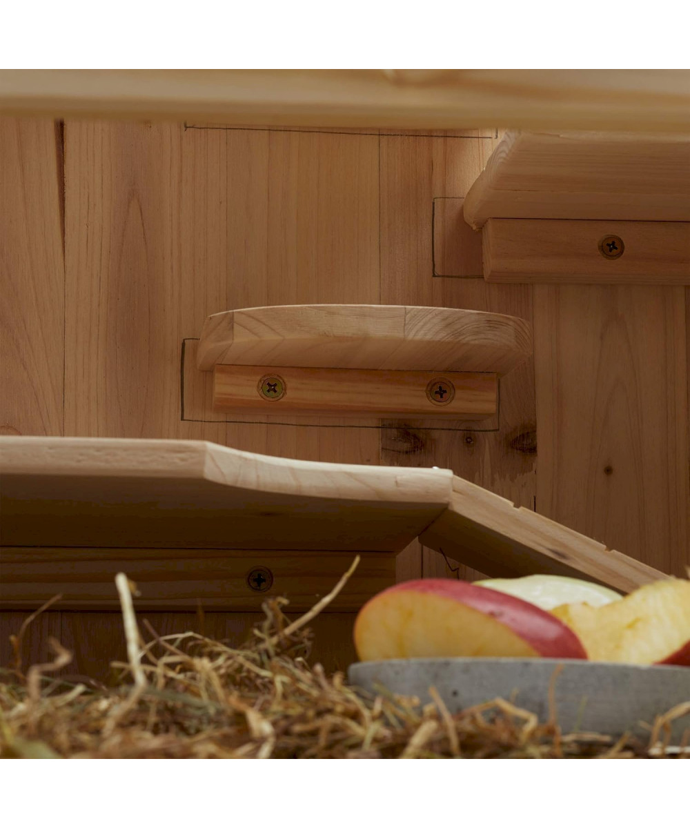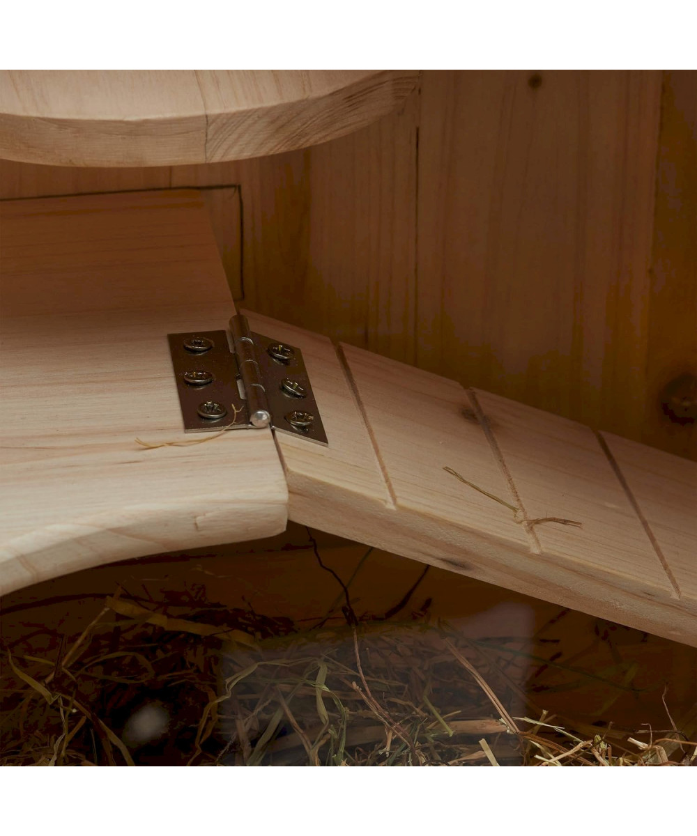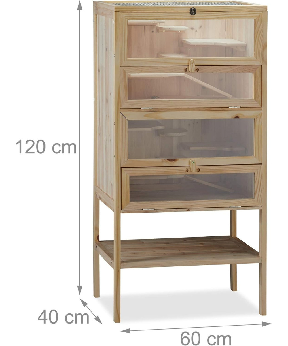Der XXL Nagerkäfig aus Naturholz bietet viel Platz für Goldhamster, Rennmäuse und andere Kleintiere. Das Hamsterhaus ist mit Podeststufen und Rampen ausgestattet, die Ihre neugierigen Schützlinge zu so mancher Erkundung animieren werden. Für die optimale Luftzufuhr sorgt das Gitterdach der Nagervilla. Dieses lässt sich genauso wie die Frontklappen des Käfigs mit wenigen Handgriffen schließen. Dank der Sichtfenster haben Sie jederzeit einen guten Überblick darüber, was im Inneren des Mäusekäfigs vor sich geht.