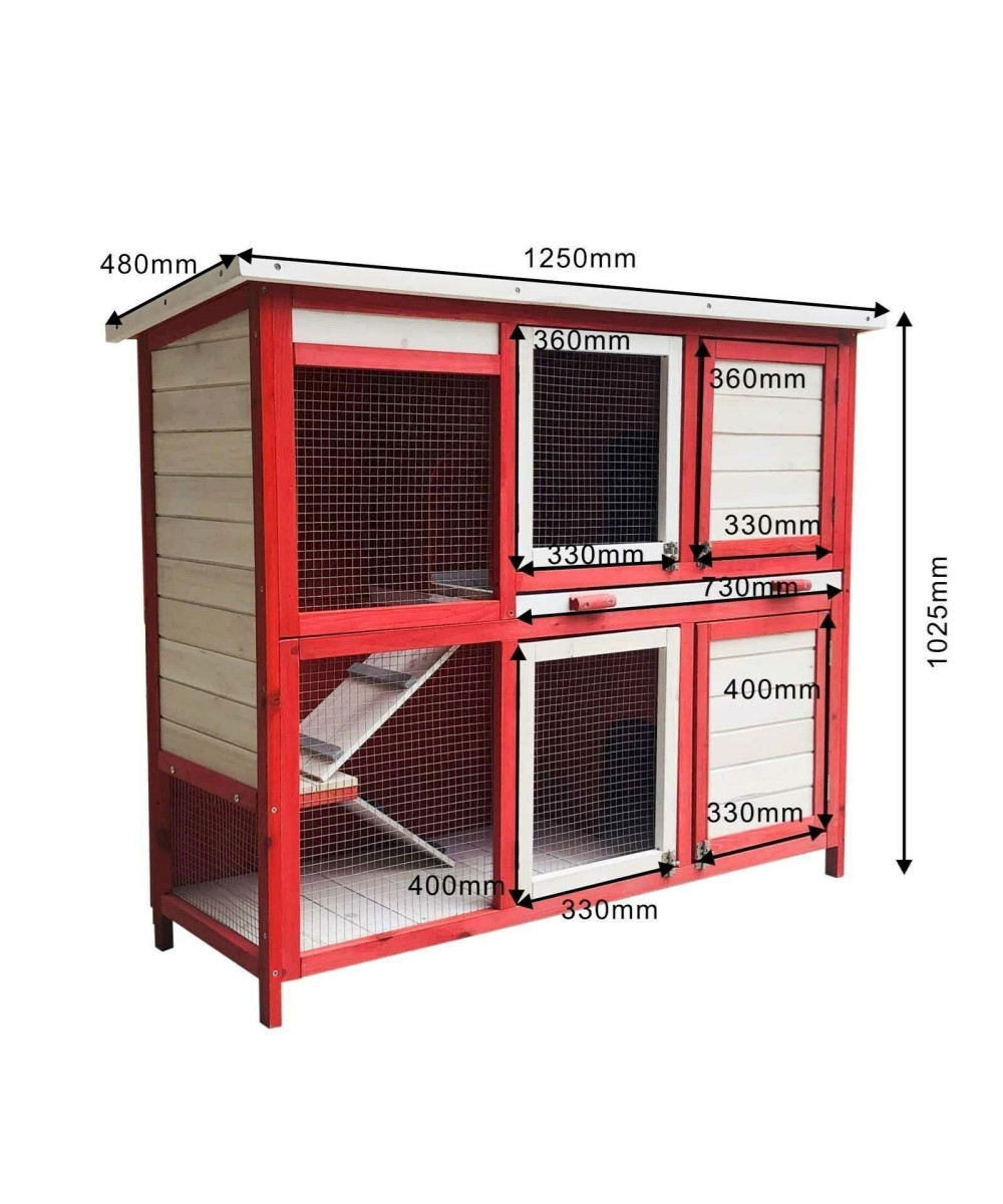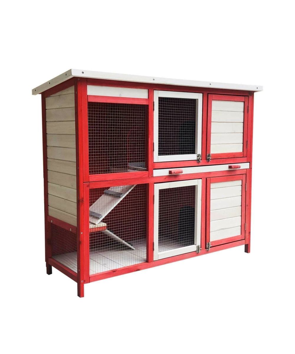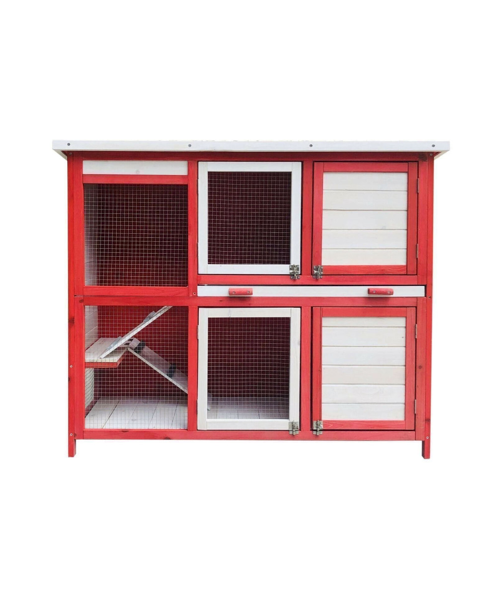Hasenstall mit zwei Ebenen & Treppe, ausziehbarer Boden, Rot-Weiß