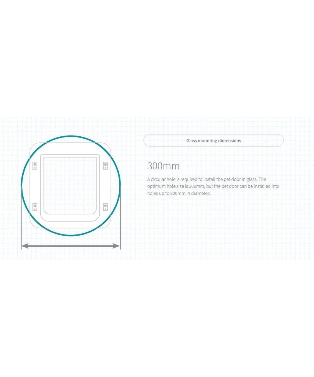Für den Einbau in Glas ist ein rundes Loch in der Glasscheibe erforderlich. Der ideale Durchmesser beträgt 300mm, die Katzenklappe kann aber in Löcher bis zu 320mm eingebaut werden. - Tiefe des Frontahmens: 50mm