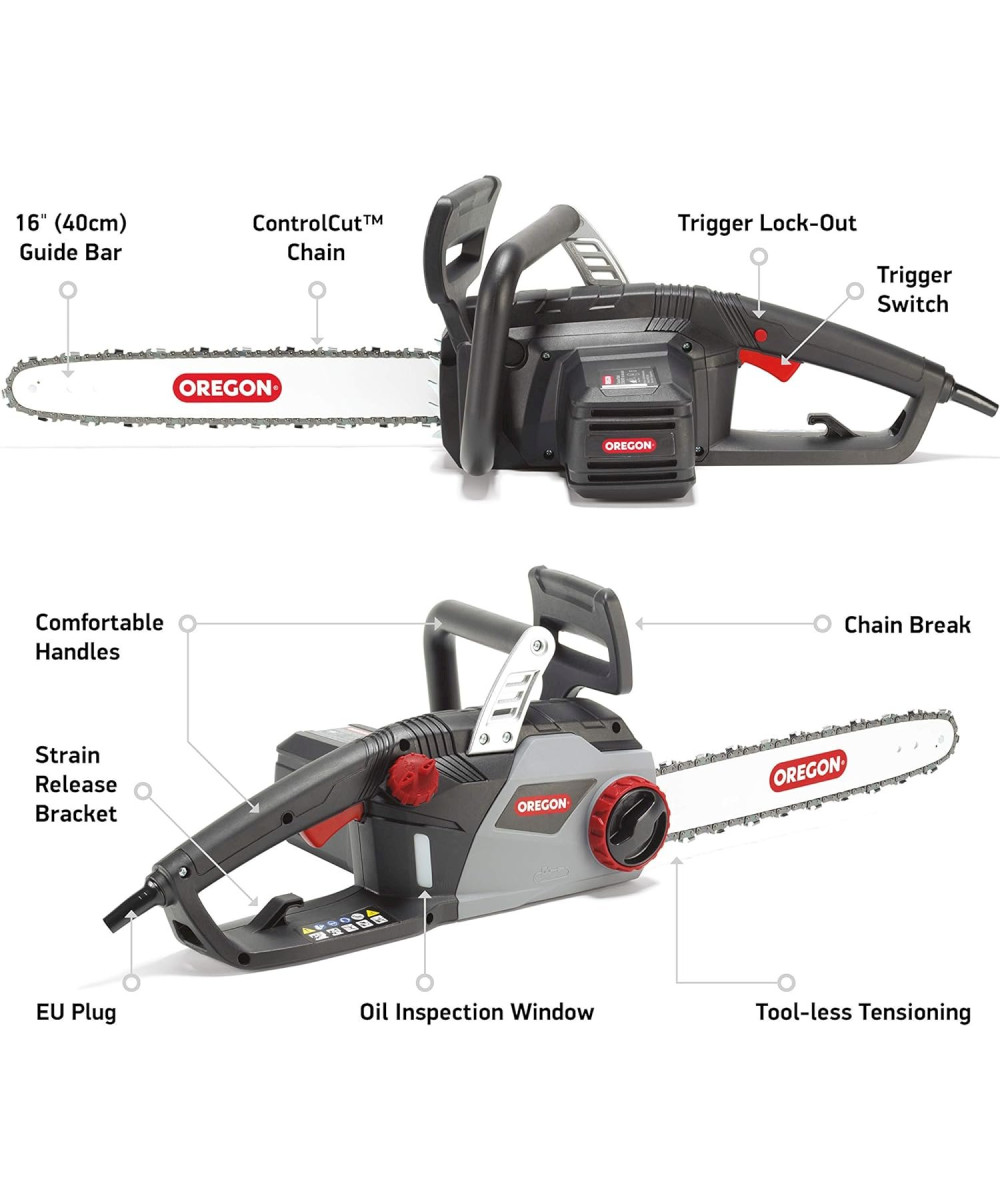 Wenn Sie auf der Suche nach einer leistungsstarken, geräuscharmen Elektro-Kettensäge für das Trimmen von Ästen und Zweigen in Ihrem Garten sind, ist die kabelgebundene Oregon CS1400 die richtige Wahl. Sparen Sie sich Zeit und Ärger, denn die CS1400 startet sofort und benötigt kein Benzin-Öl-Gemisch. Diese vom weltweit führenden Sägekettenhersteller hergestellte Kettensäge hat eine Kette von 40 cm (16"), die Sie mit Hilfe des eingebauten Spannrings ohne Werkzeug spannen können. Der automatische Öler verteilt das Öl im montierten Zustand auf Schiene und Kette, so dass Ihre Kettensäge geschmiert bleibt und ein vorzeitiger Verschleiß verhindert wird.