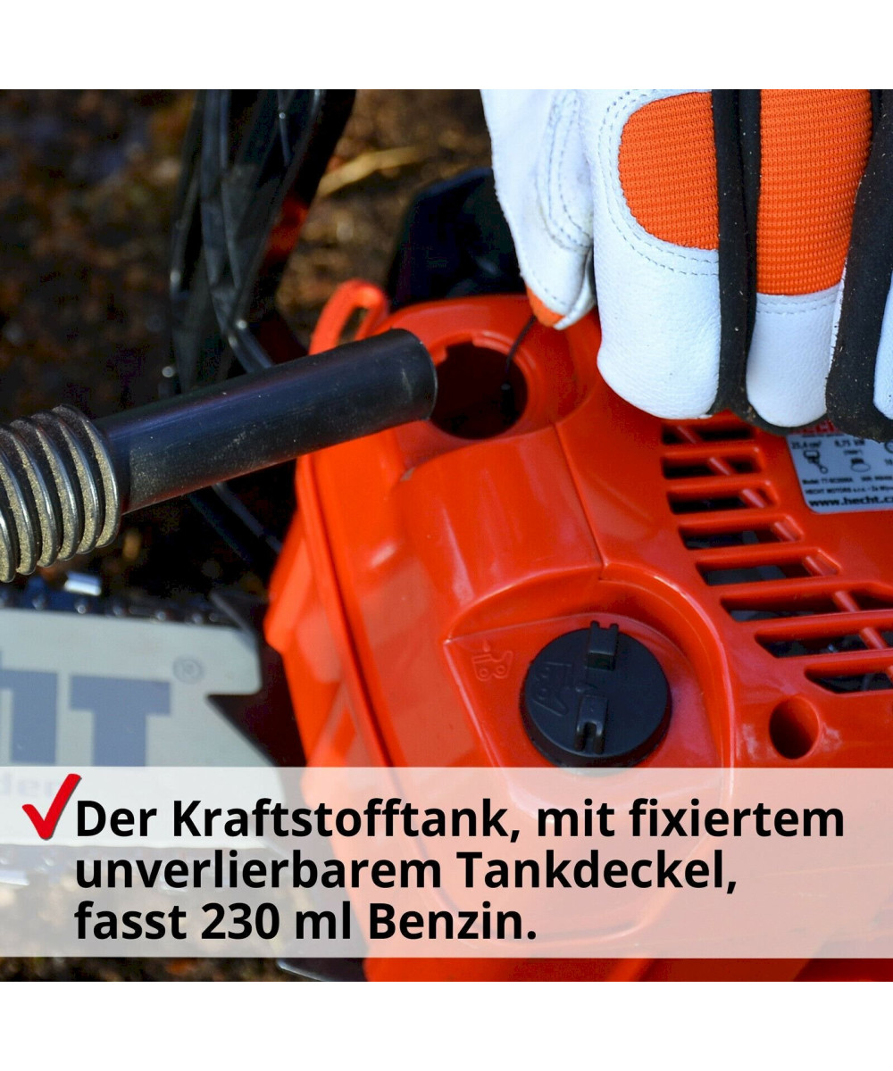 Mit dieser leichtgewichtigen Benzin-Kettensäge von HECHT 929 R können Sie direkt mit dem Durchforsten und Entasten beginnen. Die kompakte Motorsäge ist mit einem 30 cm Schwert und einer HECHT Markenkette mit 44 Kettentriebgliedern ausgestattet. Die effektive Schnittlänge beträgt 24 cm.