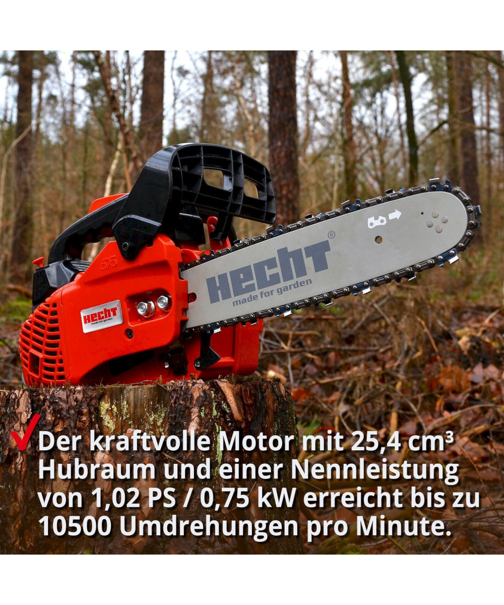 Erstklassige Verarbeitung und starke Leistung zeichnen die HECHT 929 R besonders aus. Der luftgekühlte 2-Takt-Motor erreicht eine maximale Drehzahl von 10500 Umdrehungen pro Minute und bietet mit dem 25,4 cm Hubraum eine Motorleistung von 1,22 PS / 0,90 kW . Die Benzinmotorsäge erreicht ein Kettengeschwindigkeit von 12,3 Metern pro Sekunde.