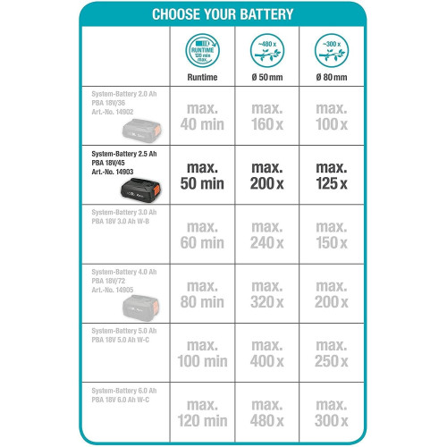 Dank einer LED-Anzeige direkt am Griff bist Du immer über den aktuellen Ladezustand informiert. Mit dem mitgelieferten 2,5Ah-18V-Akku beträgt die Laufzeit bis zu 50 Minuten oder bis zu 200 Schnitte von Ästen mit 50 Millimeter Durchmesser.
