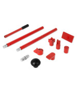 Das umfangreiche und in der Lieferung enthaltene Zubehör ermöglicht zahlreiche Anwendungsmöglichkeiten wie Drücken, Heben oder Spreizen von Gegenständen. Die einzelnen Teile der Karosseriepresse werden über ein Stecksystem montiert und bieten dadurch maximale Flexibilität. Die sichere Konstruktion lässt sich einfach zusammenbauen und ermöglicht einen schnellen Wechsel der Einzelteile.