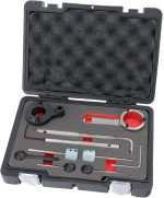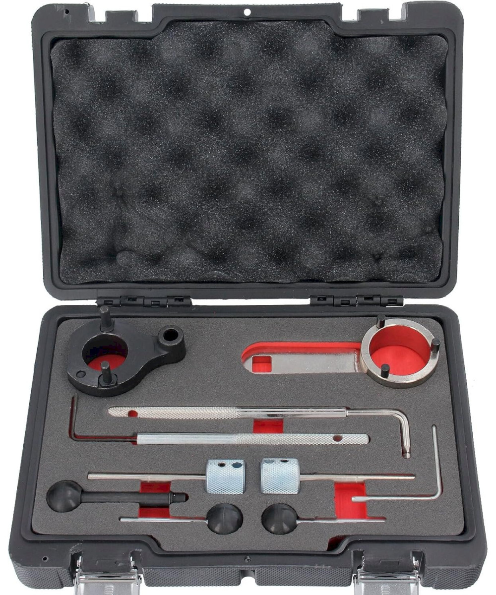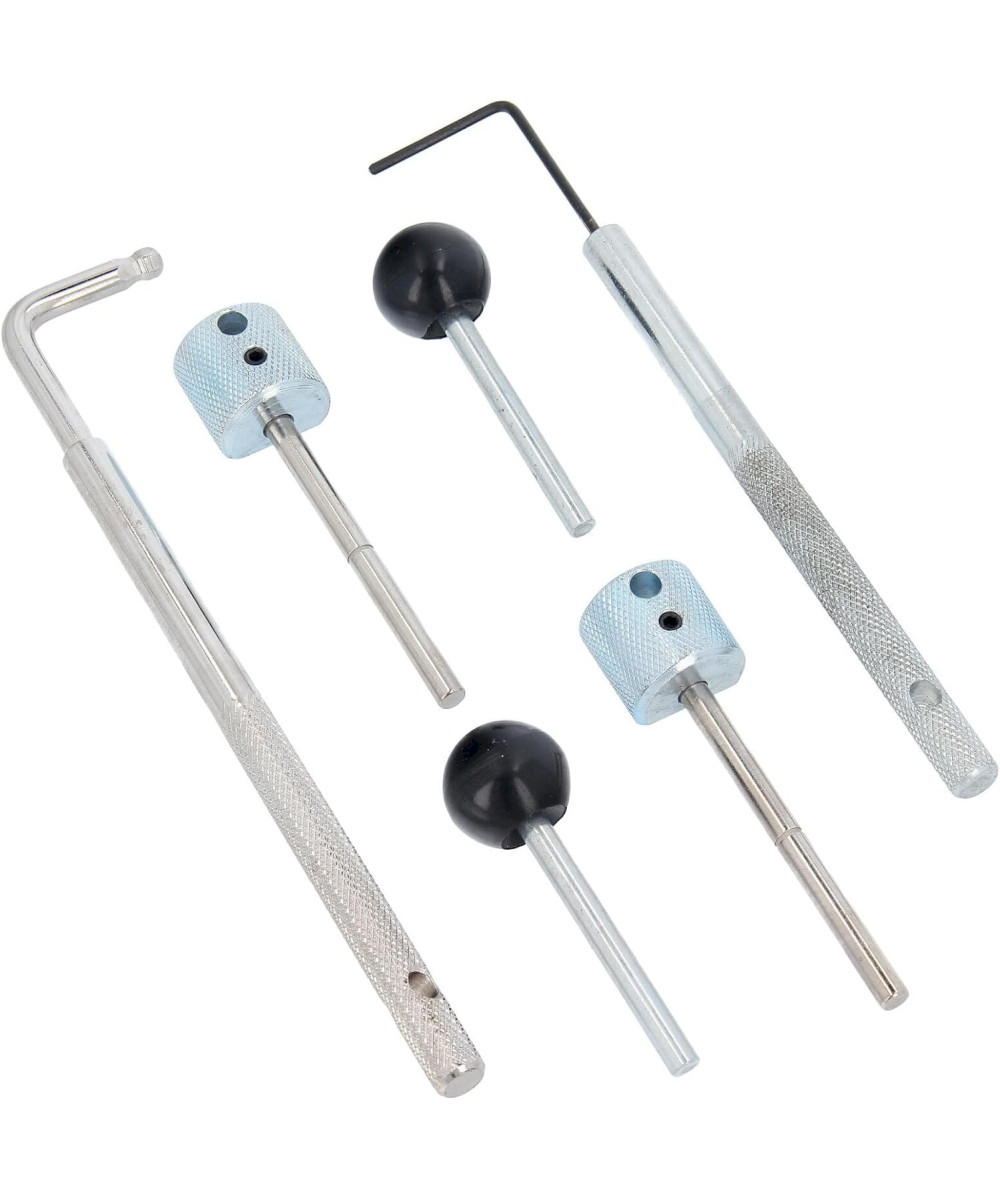 Der Satz beinhaltet alle wichtigen Absteck-Stifte und Adapter die zur Einstellung der Steuerzeiten von der Nockenwellen im Motor erforderlich sind.