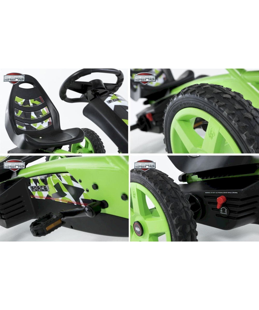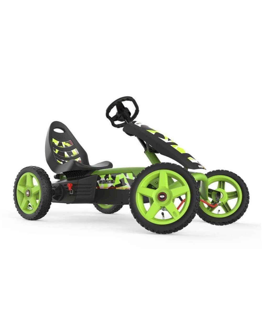 Schnell und kompakt unterwegs - so macht draußen Spielen Spaß!Der BERG Rally Force ist ein leichtes und kompaktes Pedal-Gokart für jede Gelegenheit. Das Fahrzeug wiegt nur 25 kg und ist mit seinen kompakten Maßen schnell verstaut. Dank des verstellbaren Sitzes und Lenkrads wächst der BERG Rally Force mit Kindern von 4 bis 12 Jahren mit. Mit dem BERG-Zubehör Programm macht das draußen Spielen noch mehr Spaß und wird nie langweilig. Dieses BERG-Modell ist mit Gelände-Luftreifen bestückt, was es sehr leise, wendig und griffig macht. Selbst scharfe Kurven sind kein Problem. Die Reifen bieten ein wunderbares Fahrgefühl auf jedem Untergrund. Durch die eingebaute Pendelachse werden auch sämtliche Unebenheiten immer perfekt ausgeglichen.
