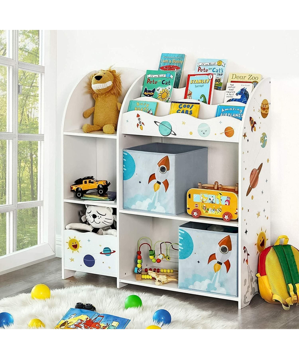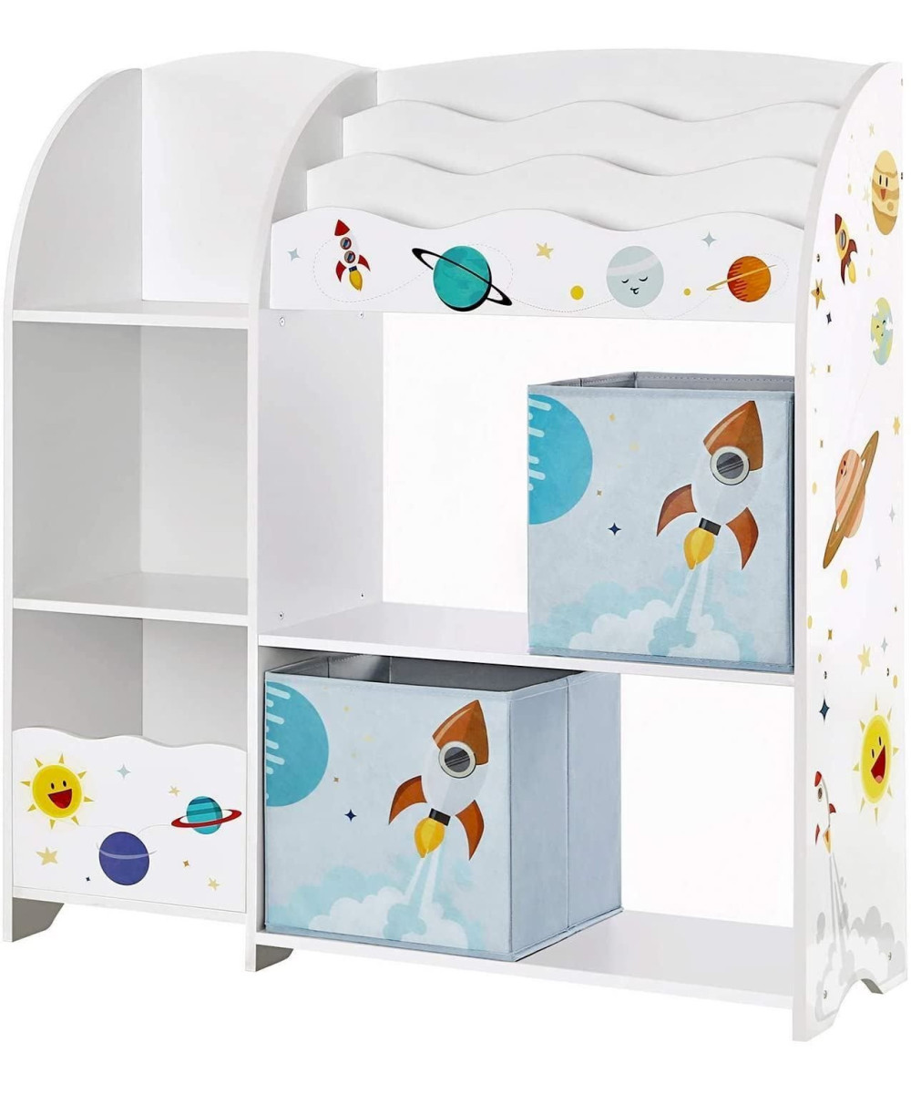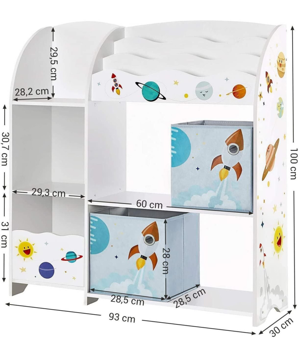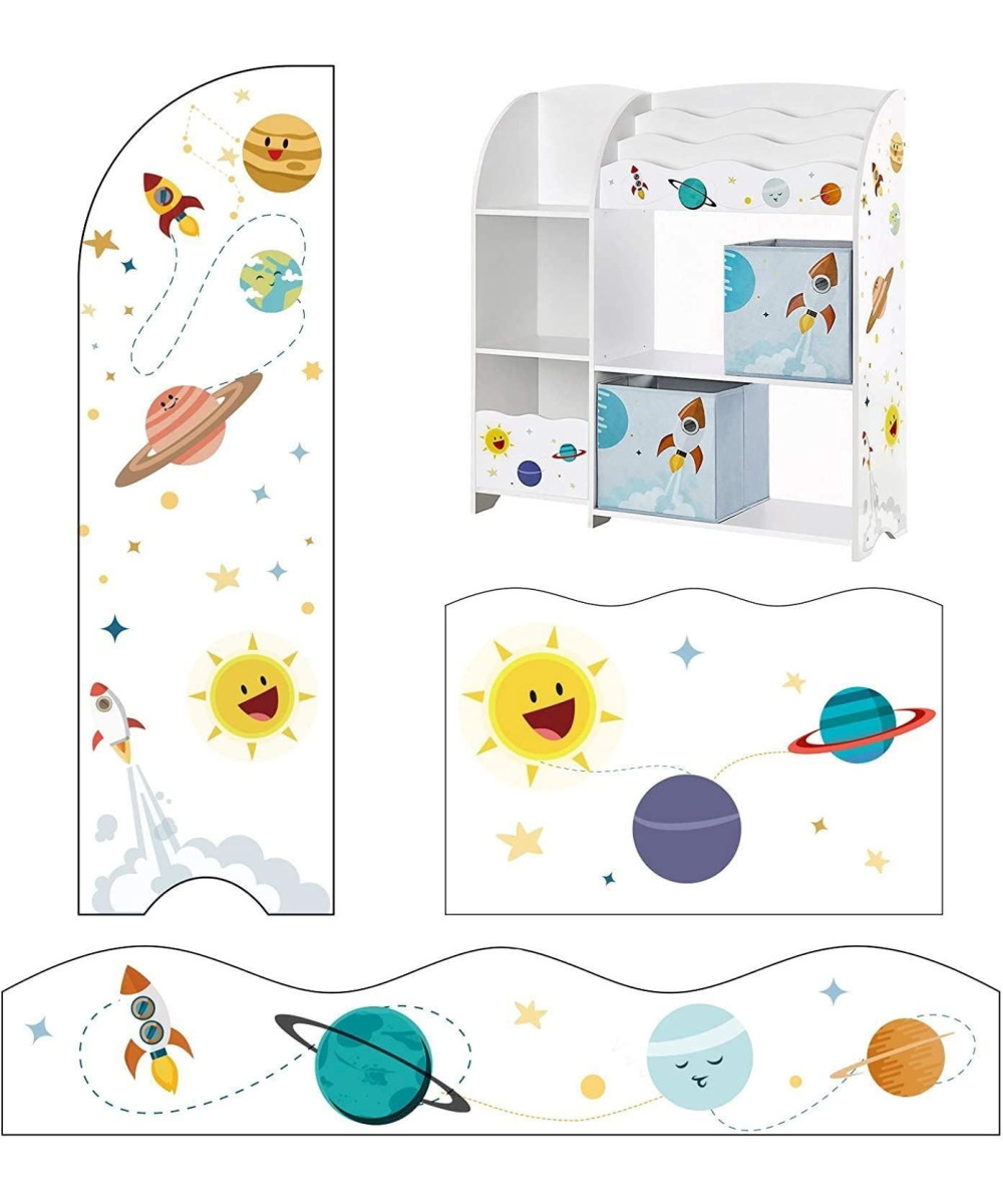 In klassischem Weiß gehalten, besteht niemals die Gefahr, dass dieses Spielzeugregal außer Mode gerät. Durch die bunten Sticker mit „Universum-Motiven“ lässt es sich zudem kindgerecht aufwerten und passt so in jedes Kinderzimmer.