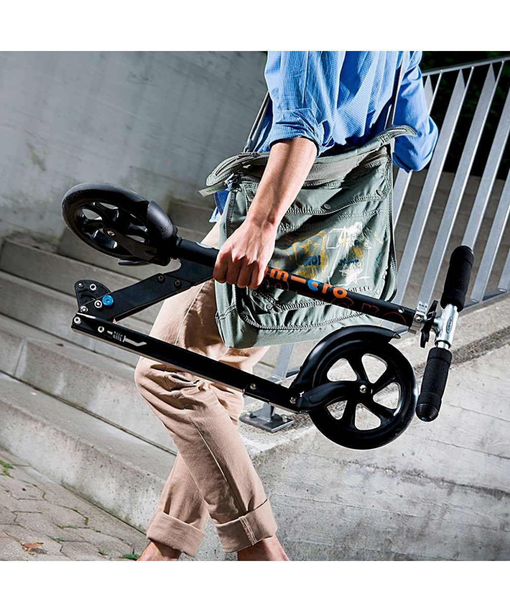 Keine Chance mehr den Kids auf ihren Micros hinterherzukommen? Den Wunsch nach bequemer und einfacher Mobilität? Wir haben die Lösung: Der Micro Scooter Black! Speziell für die Ansprüche von Erwachsenen entwickelt, ist dieser Scooter mit seinen extragrossen Rollen bestens geeignet um längere Strecken komfortabel und zügig zu überwinden. Das rittbrett hängt etwas tiefer und gewährleistet so eine ergonomische und angenehme Haltung. Mit seinem eleganten Look ist er der perfekte Begleiter auf dem Campus, in der Stadt oder wo auch immer er gebraucht wird.