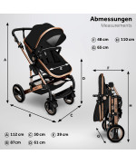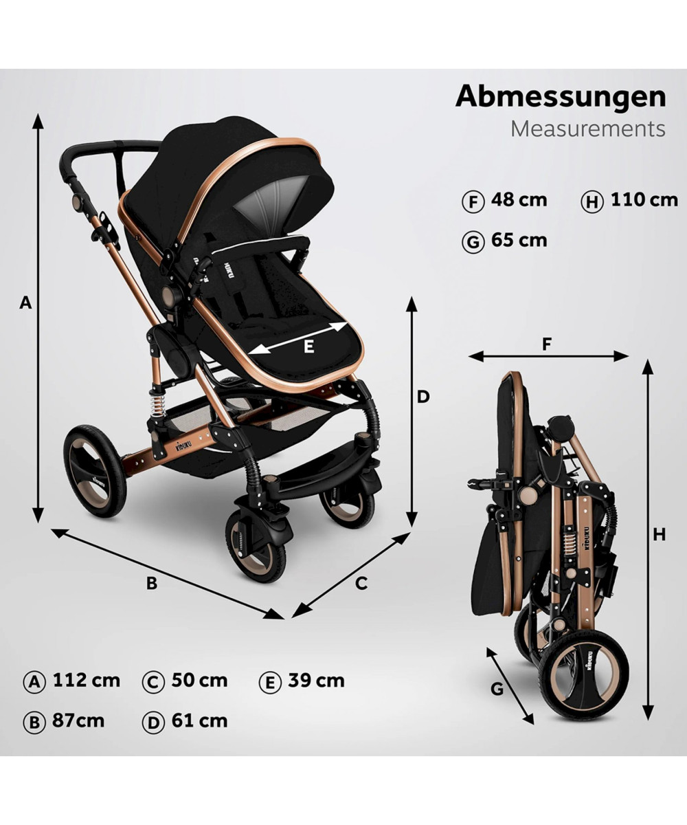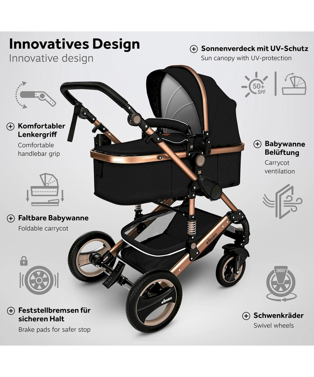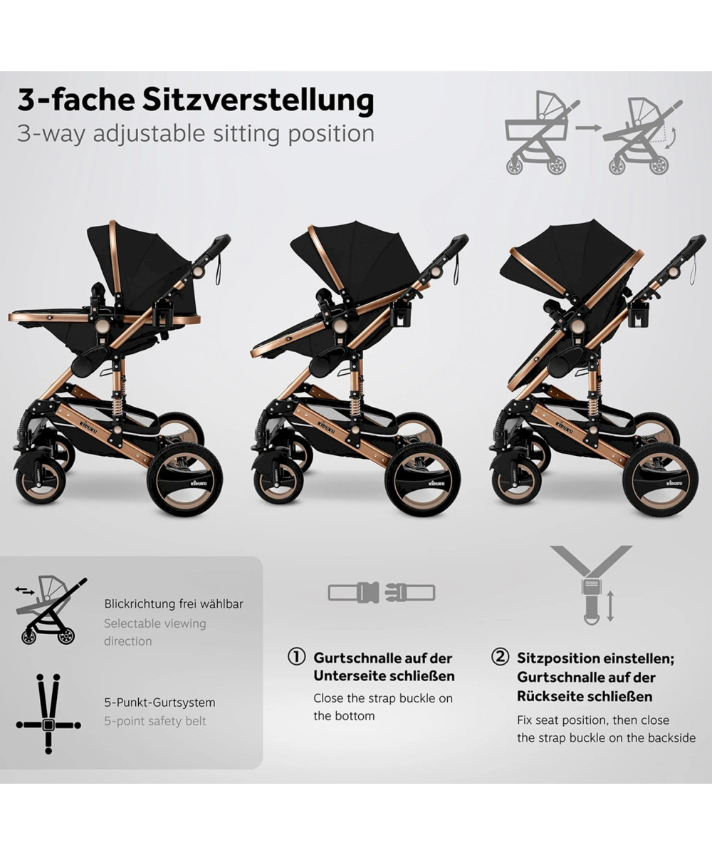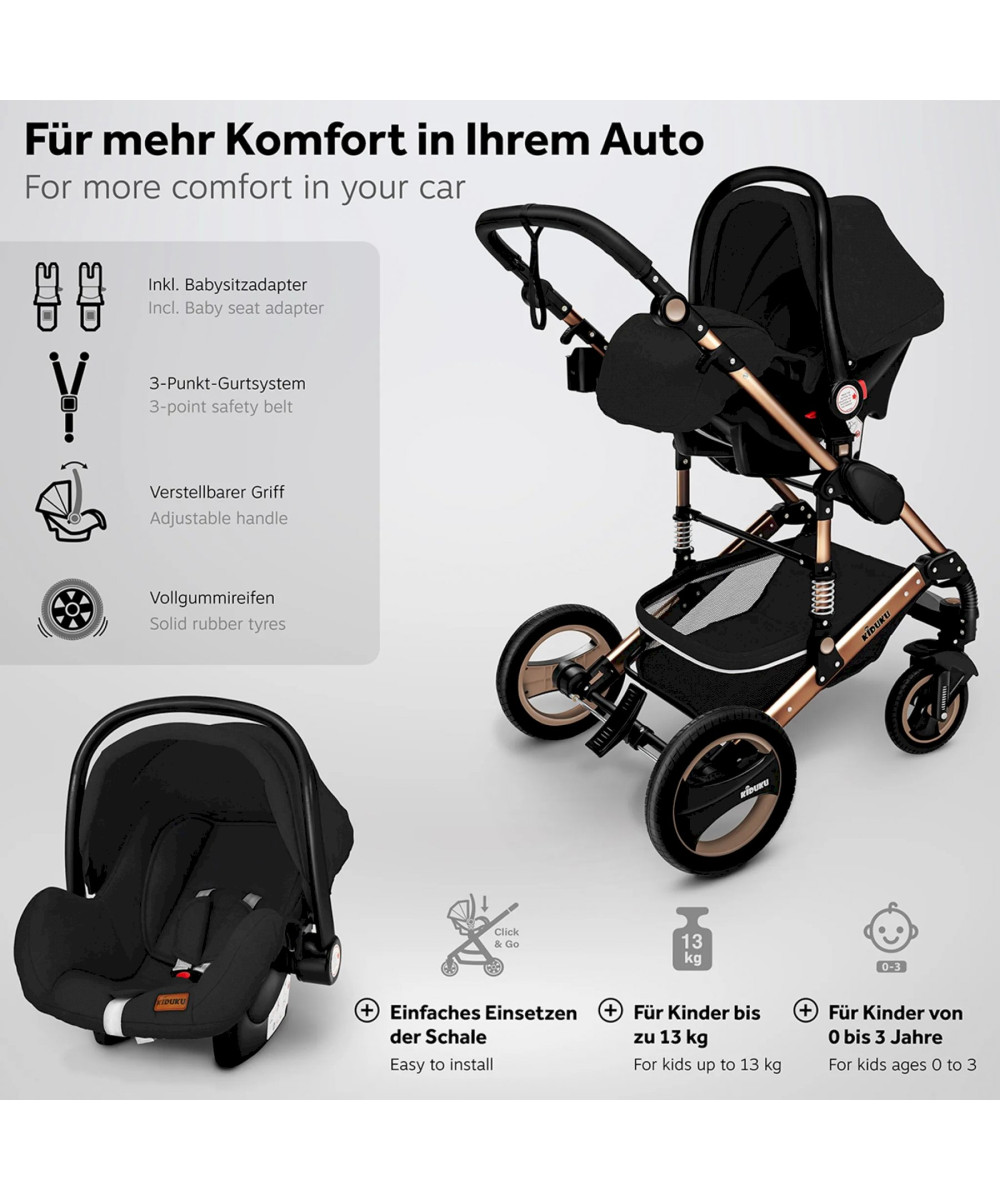 KIDUKU® 3 in 1 Kombi-Kinderwagen Buggy Reisebuggy inkl. Auto- Babyschale Faltbar SCHWARZ/GOLD