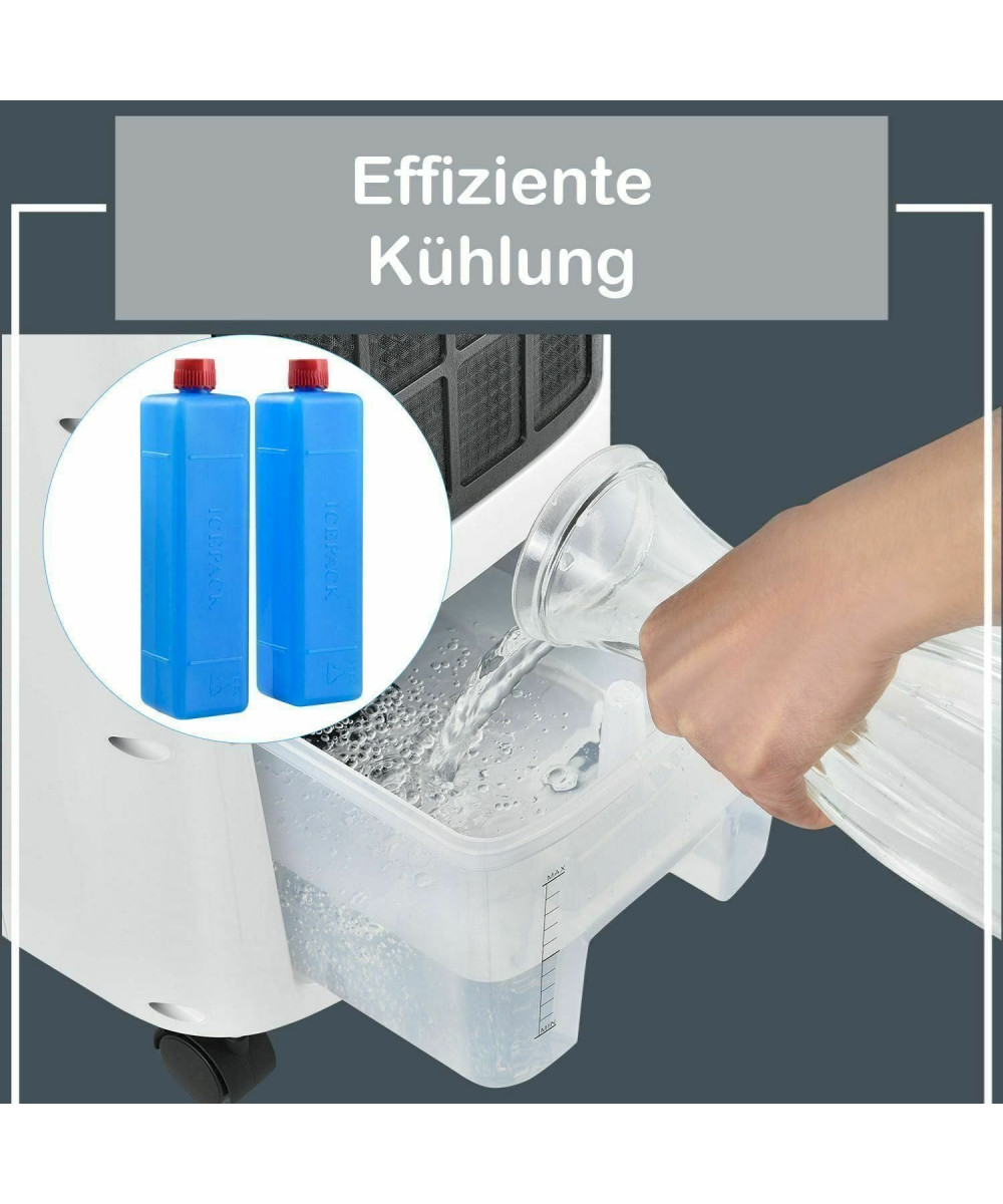 Die Gebläseluft wird durch das kalte Wasser aus dem 7 Liter großen Wassertank und die beiden Kühlakkus angenehm heruntergekühlt und befeuchtet. Der Tank hat auf der Vorderseite eine Füllstandsanzeige und lässt sich auf der Rückseite bequem herausziehen und befüllen.