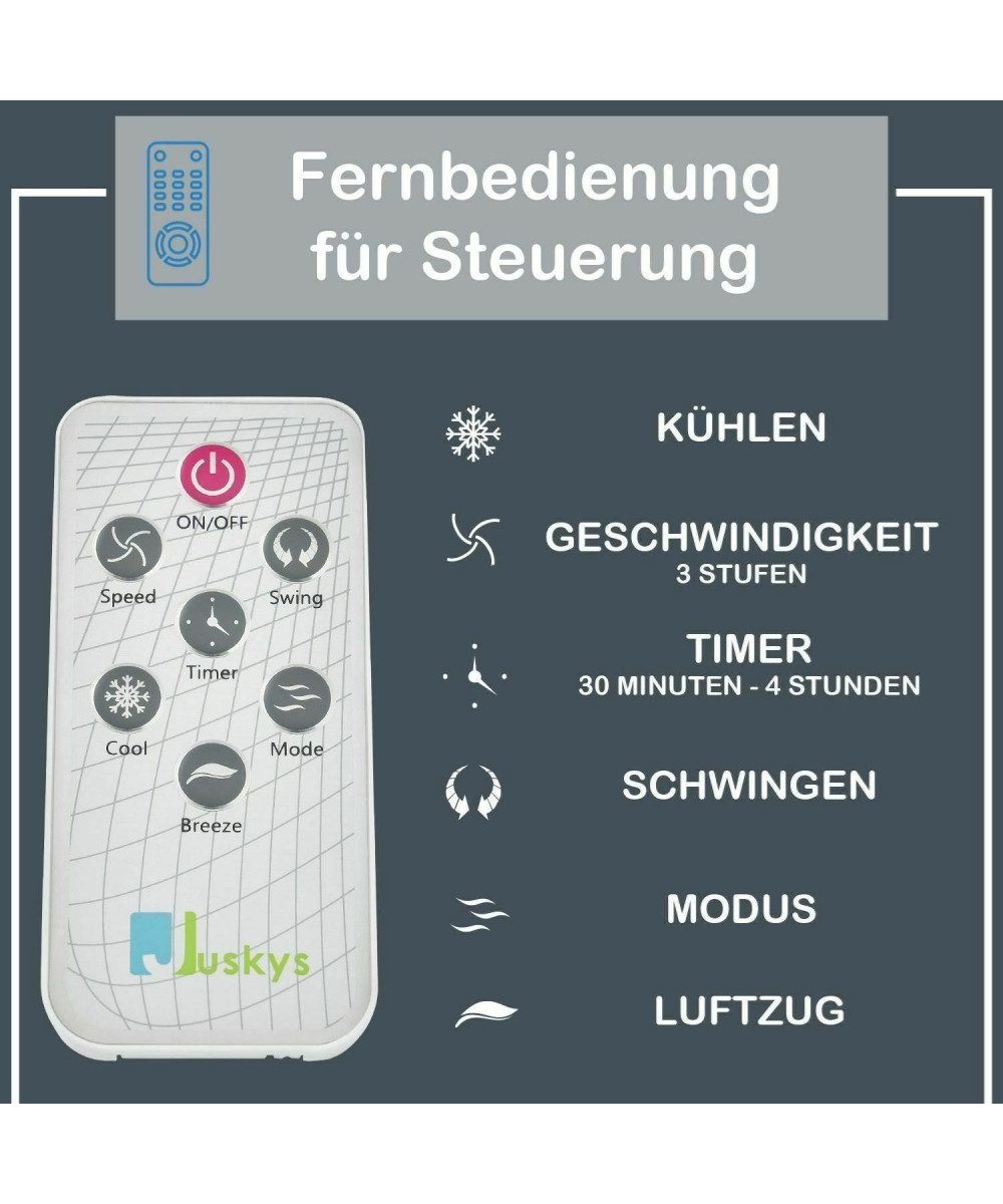 Heiße Sommertage in kühler Atmosphäre in Haus oder Wohnung verbringen? Mit dem mobilen Klimagerät 65 Watt inkl. Fernbedienung von Juskys sind Sie bestens gerüstet. Die mobile Klimaanlage mit Wassertank und Eisblöcken kühlt die Luft auf angenehme Temperaturen herunter. Geschwindigkeit, Betriebsmodi, Timer und Schwingfunktion lassen sich über das Bedienfeld und die Fernbedienung kinderleicht einstellen. Zugleich benötigt der Luftkühler nur wenig Strom und ist überaus leise. Durch seine schlichte Optik fügt sich das Gerät unauffällig in Schlafzimmer, Kinderzimmer, Wohnzimmer, Küche oder Bad.