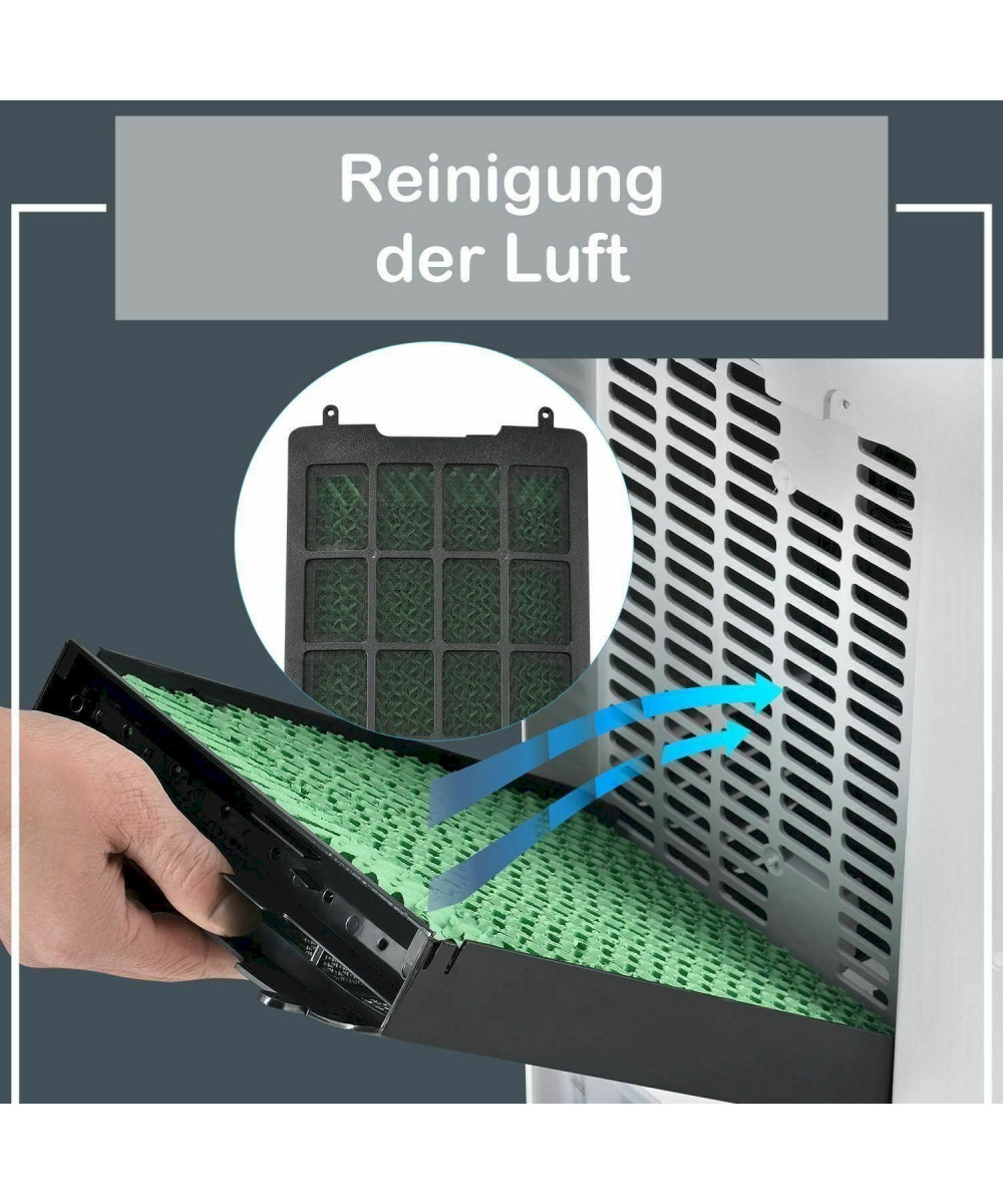 Der praktische Aircooler besitzt ein integriertes Filterystem. Der herausnehmbare Wabenfilter sorgt für eine gereinigte und frische Luft im Raum. Bei Bedarf kann er schnell herausgenommen und gereinigt werden.