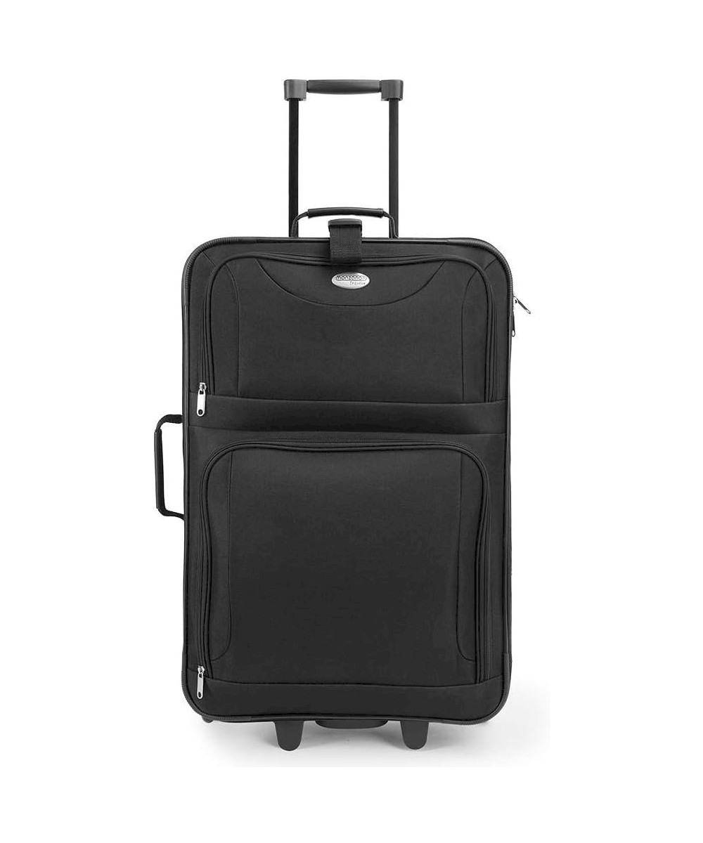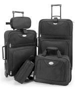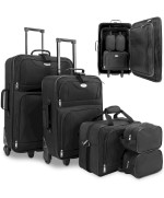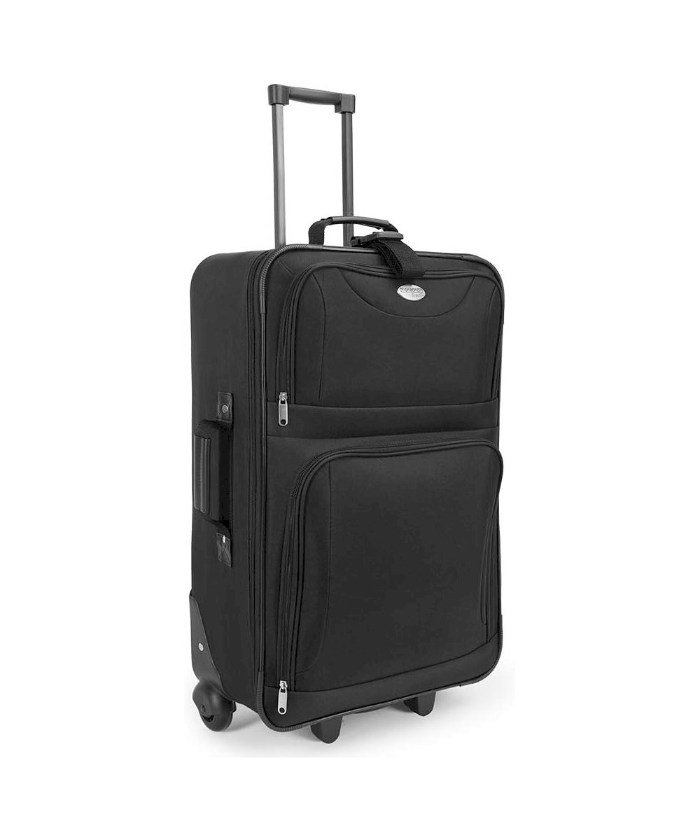 Dieses hochwertige Reisekoffer-Set besteht aus zwei großen Reisekoffern mit praktischer Trolleyfunktion, einer Schultertasche mit Tragegriffen und verstellbarem Schultergurt und zwei Kosmetiktaschen.