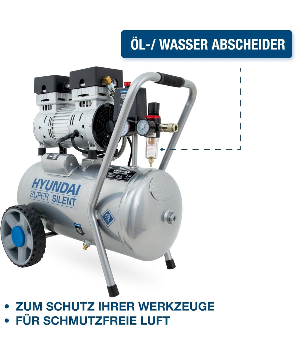 Der HYUNDAI Silent Kompressor SAC55752 ist ein sehr leiser und kompakter, aber trotzdem leistungsstarker Druckluftkompressor. Er ist kaum lauter als ein normales Gespräch, daher ideal geeignet fürs Haus oder Labor, aber auch für die Werkstatt oder Garage. Der 24 Liter fassende Druckbehälter hat einen Betriebsdruck von maximal 8 bar. Durch automatisches Ein- und Ausschalten wird der Druck im Bereich zwischen 6 und 8 bar konstant gehalten.
