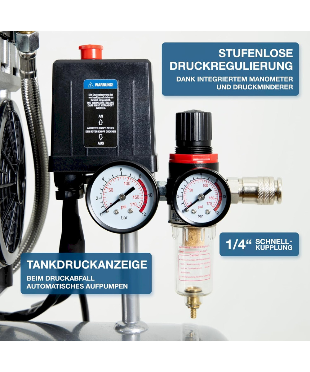 Der Kompressor hat eine Motorleistung von 0.75 kW und erreicht eine Ansaugleistung von 125 Liter pro Minute. Er läuft ÖLFREI und benötigt keine Wartung. Mit dem integrierten Manometer und Druckminderer wird eine einfache Regulierung vom Arbeitsdruck ermöglicht. Ein zusätzliches Manometer ermöglicht einfaches Ablesen des Kesseldrucks. Der vorgeschaltete Öl- und Wasserabscheider filtert Feuchtigkeit und Verschmutzungen aus der Druckluft heraus und schützt so die nachgeschalteten Werkzeuge oder Geräte.