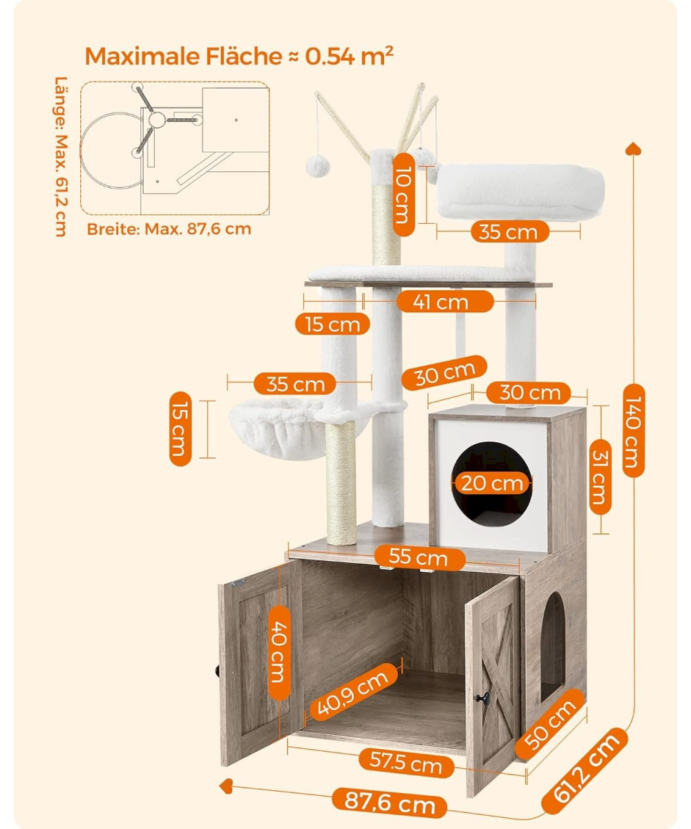 [2-in-1-Katzenmöbel] Mit der Kombination aus Kratzbaum und Katzenklo-Schrank bekommt Ihre Katze einen Ort zum Beobachten, Spielen, Entspannen und um ihre Notdurft zu verrichten, es nimmt aber nur 57,5 x 50 cm Fläche – ein wahrer Platzsparer