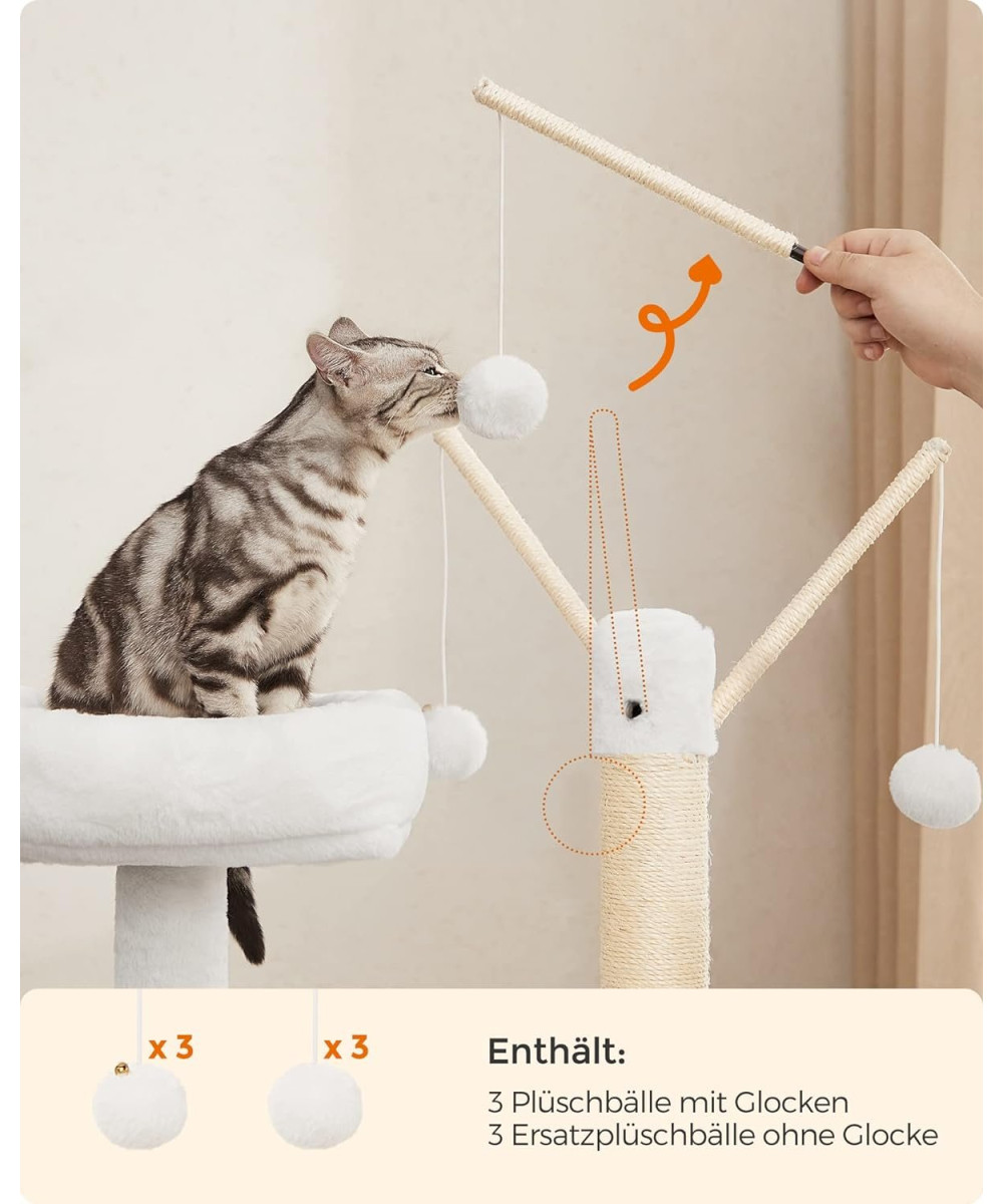 [Unbegrenzter Spaß und Komfort] 3 abnehmbare Plüschball-Stangen, Sisalstämme, eine gut gepolsterte obere Plattform, eine kuschelige Katzenhöhle und eine flauschige Liegemulde – mit diesem Kratzbaum wird es Ihren Katzen nicht langweilig werden