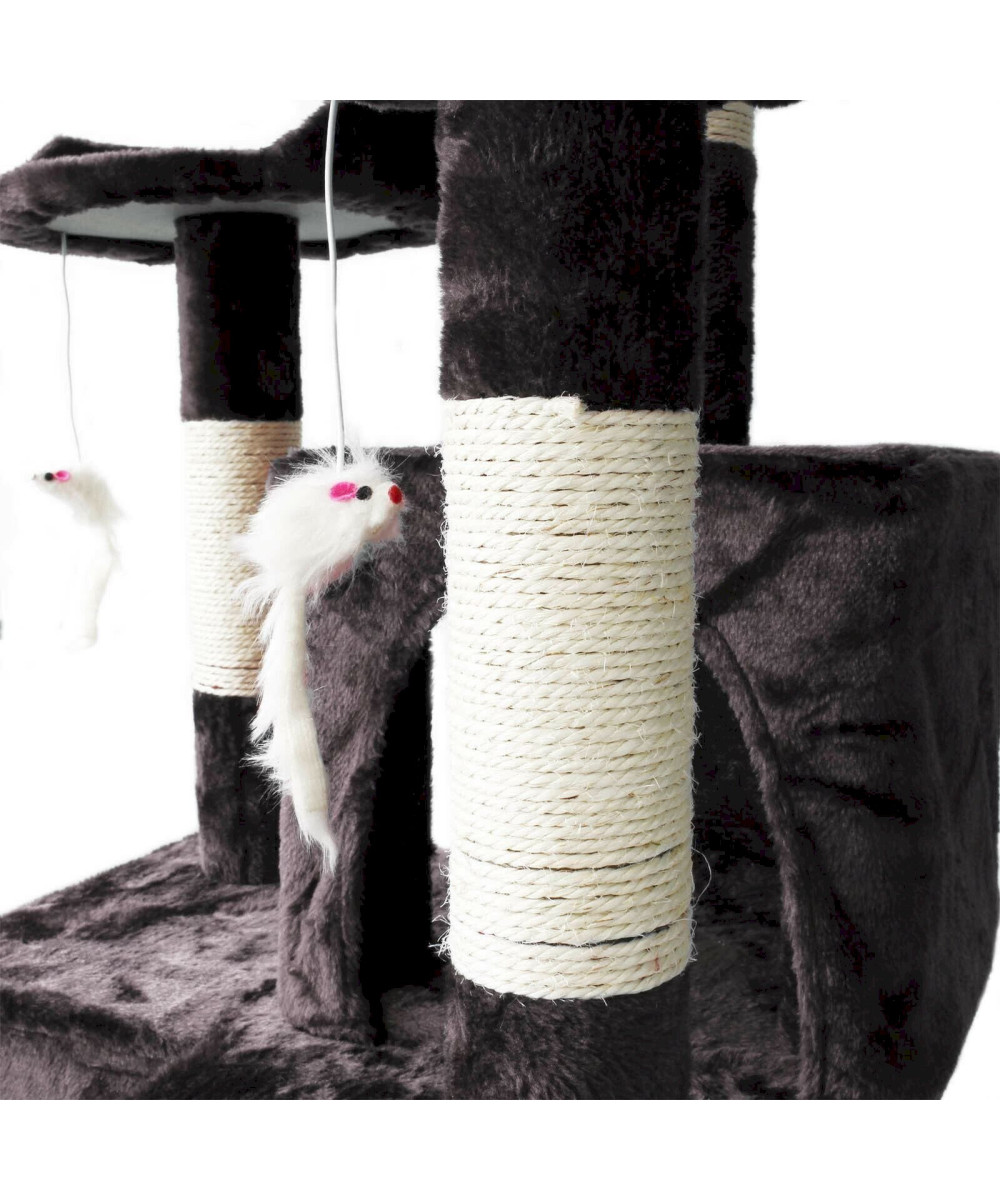 Für die nötige Stabilität sorgt die 49 x 49 cm große Bodenplatte. Die 3 Liegeflächen verfügen über eine Größe von 29 x 29 cm und bieten genug Platz für ein Schläfchen. Durch die vielfältigen Kratzmöglichkeiten rund um den Baum, ist für eine gute Krallenpflege gesorgt. Eine Bespannung mit extra weichem Stoff sorgt für die tierische Gemütlichkeit. Die Toröffnung der Katzenhäuser beträgt 17-20 cm, sodass die Katzen problemlos in die Höhlen passen. Dadurch, dass die Aussichtsplattformen schwenkbar sind, hat der Kratzbaum eine variable Breite von 50 bis 60 cm.
