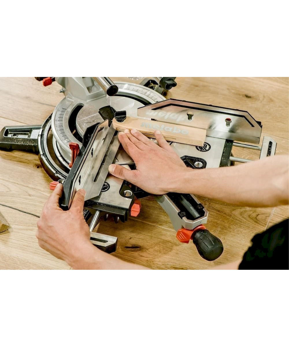 - Hohe, seitlich verschiebbare Anschläge für sicheres Sägen
