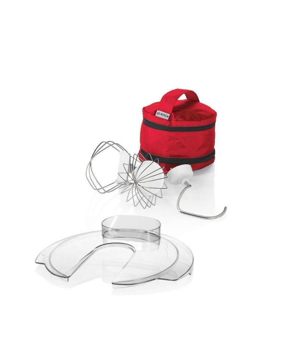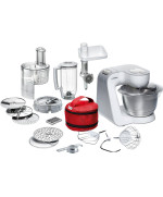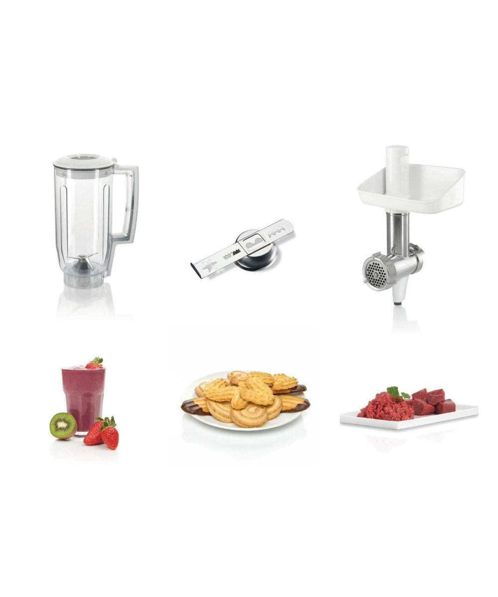 Mit Patisserie-Set (Schlagbesen, Rührbesen, Knethaken), Durchlaufschnitzler mit 5 Scheiben zum Raspeln, Reiben, Schneiden, zusätzlich Mix-Aufsatz und innovativer Würfelschneider.