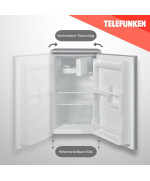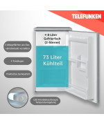 Mit einem großzügigen Nutzinhalt von insgesamt 81 Litern (73 L Kühlen / 8 L Gefrieren) bietet die Kühl-Gefrierkombination von Telefunken ausreichend Platz für einen einen Single- oder Zwei-Personen-Haushalt. Der Telefunken Kühlschrank verfügt zudem über eine praktische Abtauautomatik im Kühlraum. - Perfekte Organisation
