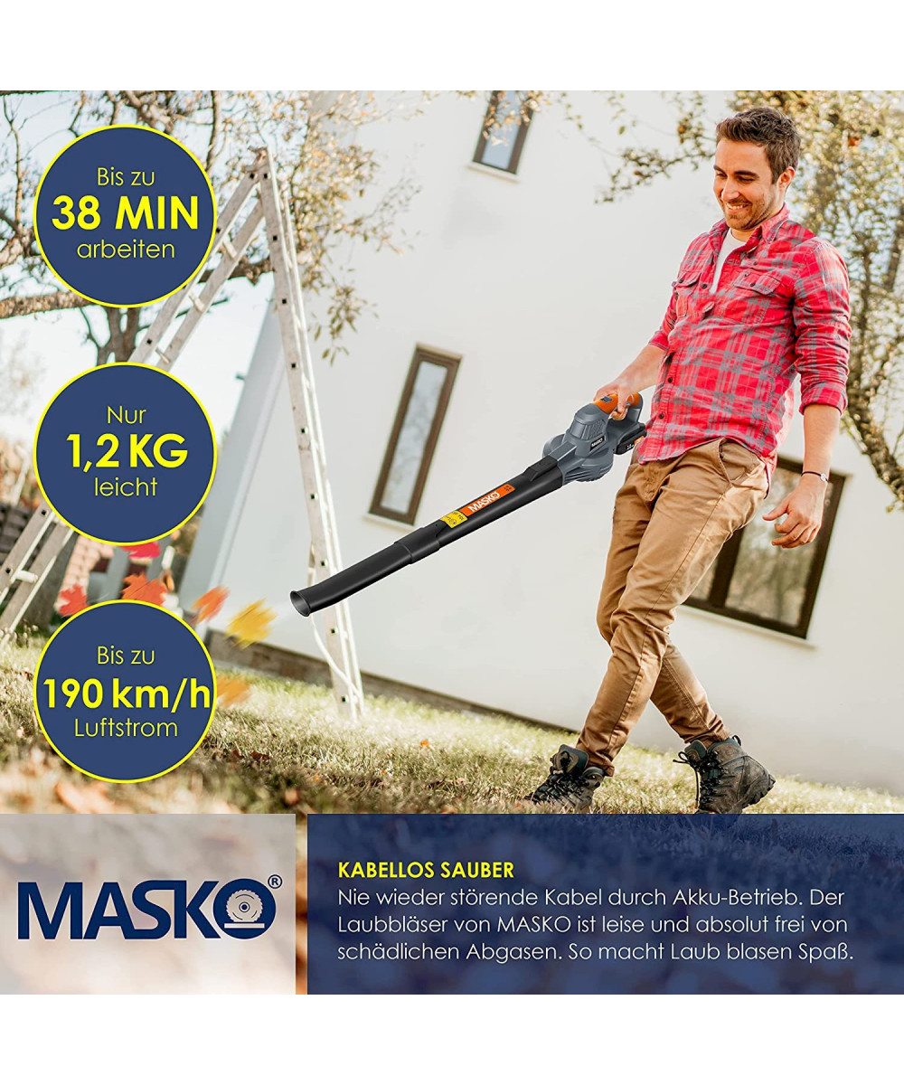 Egal ob Blumenbeet , Gartenweg , Rasen oder Garagenauffahrt : Unser hochwertiges Laubgebläse aus dem Hause MASKO ist ideal und schnell zur Hand , um große Gärten und Einfahrten schnell und einfach von herabgefallenen Blättern und Schmutz zu befreien . Der Vorteil unseres Elektro - Laubbläsers ist, dass er umweltfreundlicher und deutlich leiser als ein Benzin - Laubgebläse ist. Zudem ist unser Akku - Laubgebläse weniger wartungsintensiv als Benzin - Laubbläser und bietet dabei dennoch viel Leistung und eine lange , unterbrechungsfreie Arbeitszeit . Die Nutzung macht sich zudem im Geldbeutel bemerkbar , denn Benzin und Öl sind Geschichte . Laden Sie den Akku mit unserem Power - Charger innerhalb von nur einer Stunde vollständig auf und legen Sie direkt los. Nie wieder störende Kabel oder schädliche Abgase .